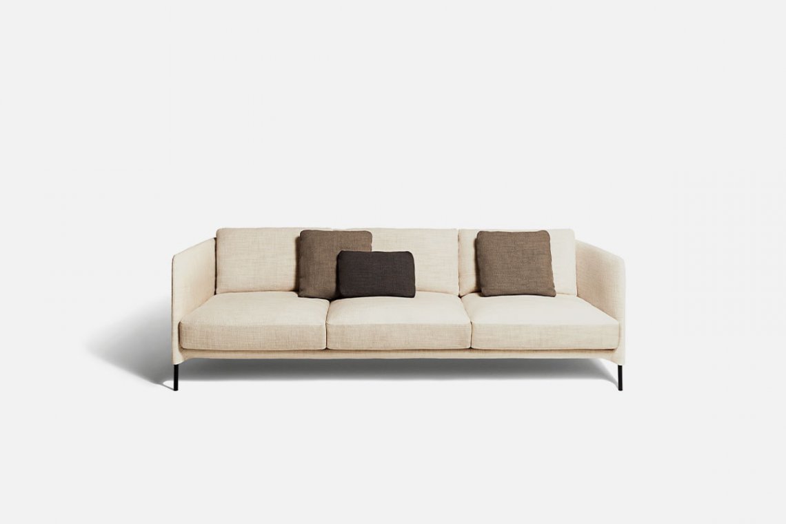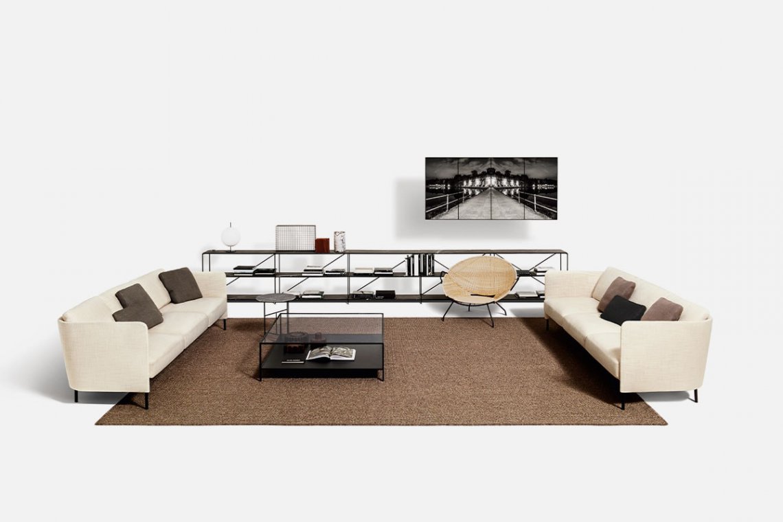 The light lines of designer Omi Tahara have a strong common thread: an enveloping structure that balances the sleekness of the seating. The large cushions are soft and inviting, creating a successful contrast that makes the space particularly comfortable and flexible. An armchair completes the collection.