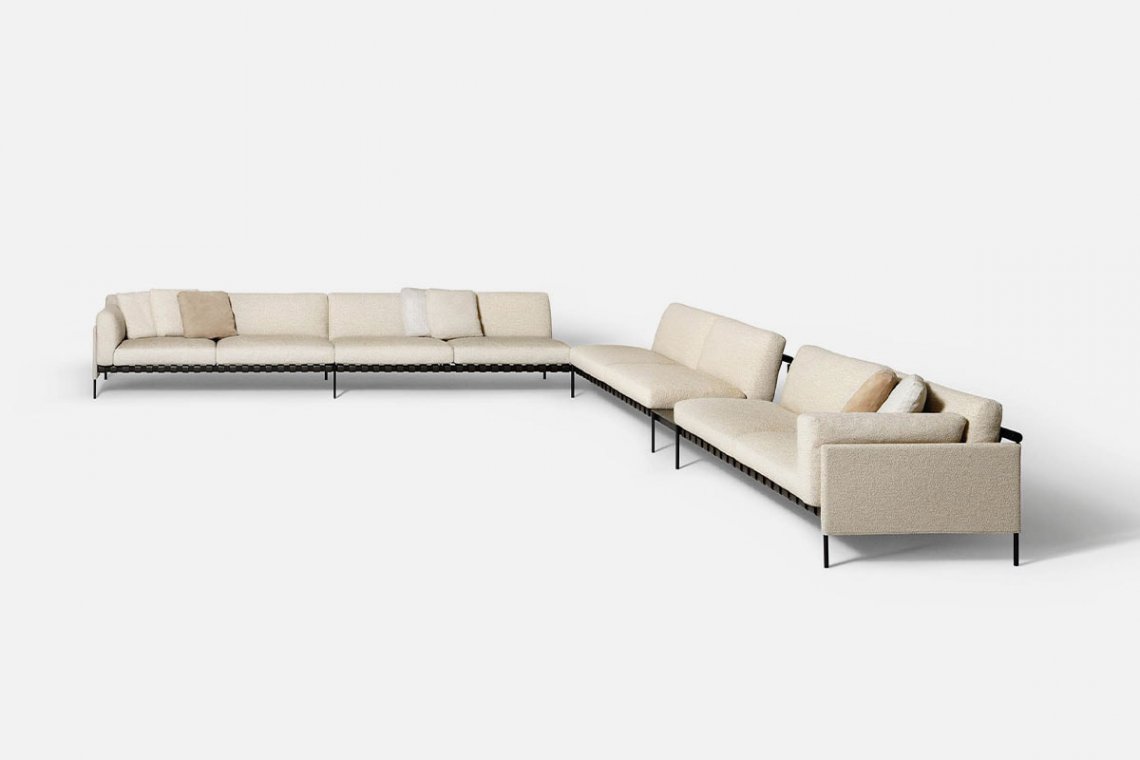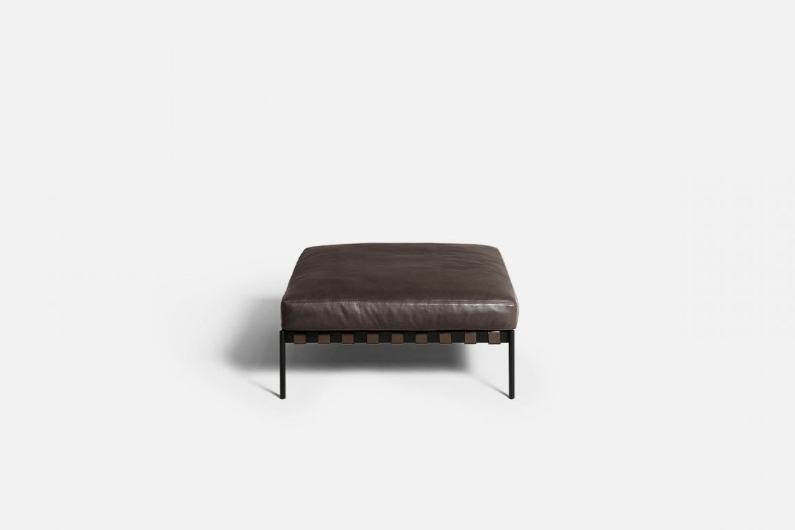 The Scandinavian-inspired structure dialogues with outstanding Italian craftsmanship. The étiquette project, which includes a sofa and pouf, is by the GamFratesi duo. A regular and cohesive matte black steel frame is completed with leather straps and a charcoal-colored ash wood bar. The atypical construction makes it an excellent solution for defining spaces, also thanks to the stunning back view.