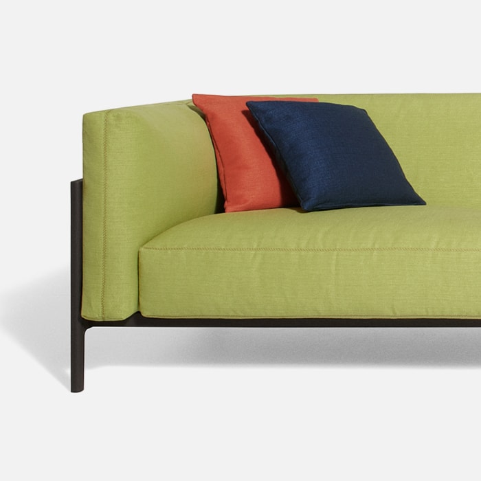 The Charcoal-stained Solid Ash wood structure is minimal, favouring the shape and colour of the palette, which includes deep shades of midnight blue and peacock, neutrals such as ecru, earthy tones such as brick red, and the vibrant surprising note of lime green – the iconic colour of the collection.