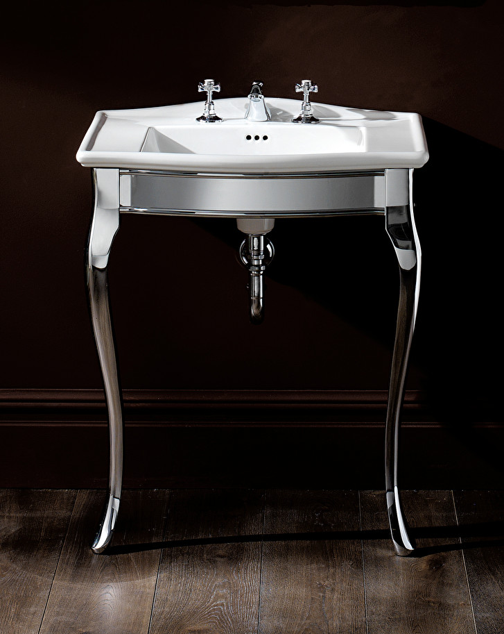 This console reinterprets the eighteenth-century inspiration focusing on the need of contemporary living. Thanks to its small sizes it can also be placed in small rooms, giving them great charm. The bearing structure in fused aluminium is available in light gold, chrome or polished nickel finishes. It is completed with Westminster porcelain basin.