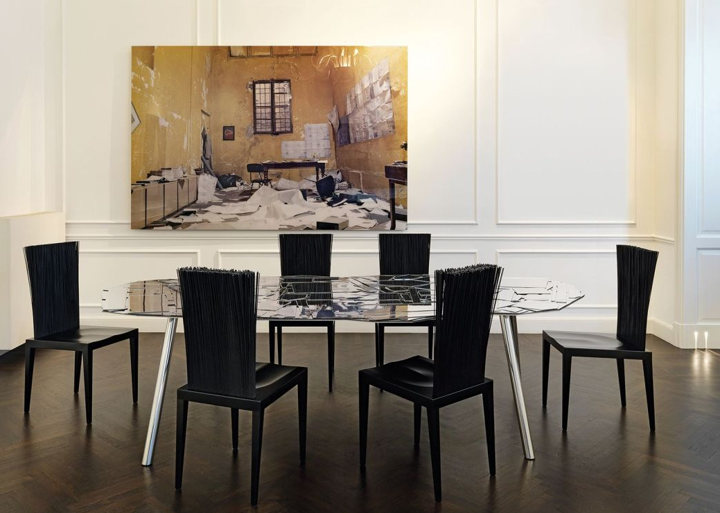 Grazie allo schienale flessibile, questa sedia stampata in poliuretano e con armatura di metallo è un punto d’unione tra rigido e flessibile. Lo schienale è formato da un ventaglio di steli di PVC che si modellano in posizione libera con l’uso.