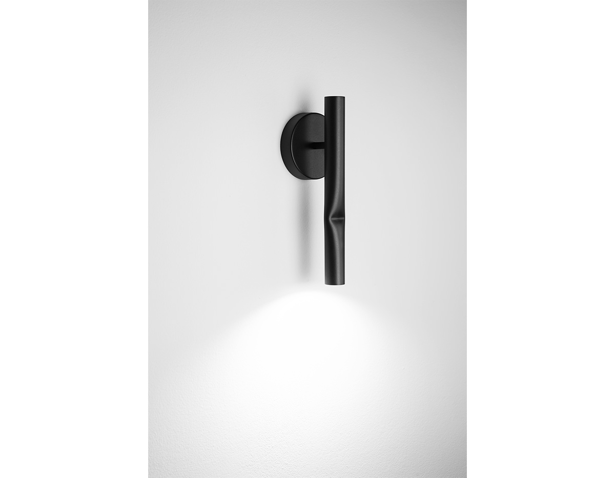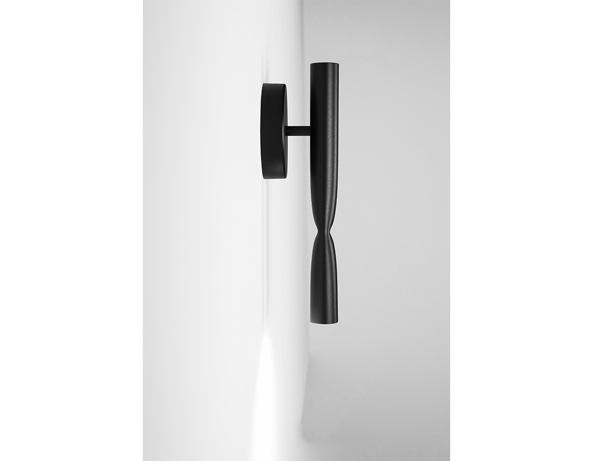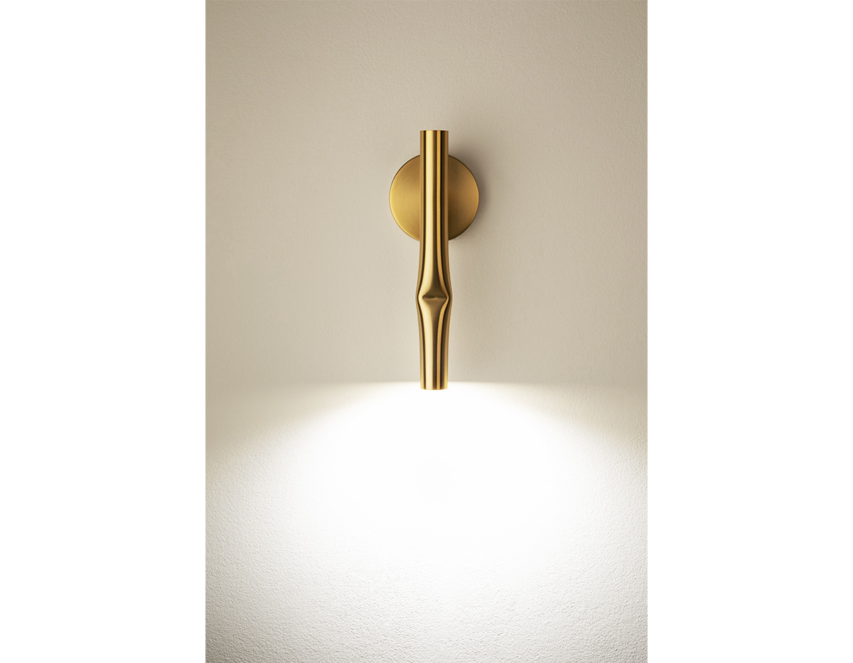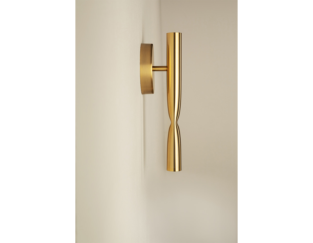 Metallic wall lamp made with a metal tube smashed in the middle and an acrylic lens and integrated LED light facing up or facing down.