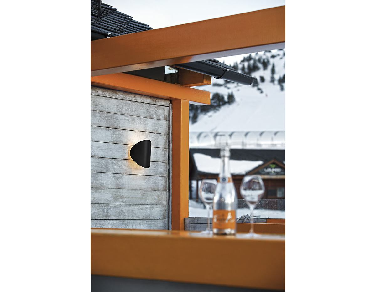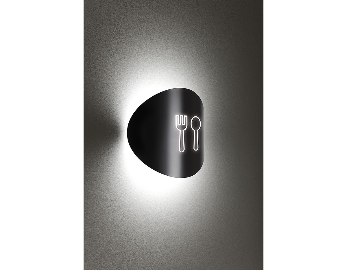 Metal wall lamp suitable for indoor and outdoor with an interior shade made of polyethylene and integrated dimmable LED. The curved metal front plate allows laser-cut signage with custom creations including ideograms, logos and texts.