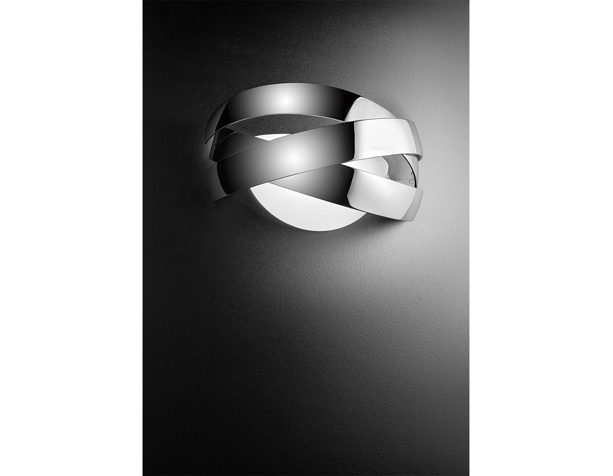 Wall lamp providing direct and indirect light. Shade is made of a satinated glass and decorative aluminium rings.