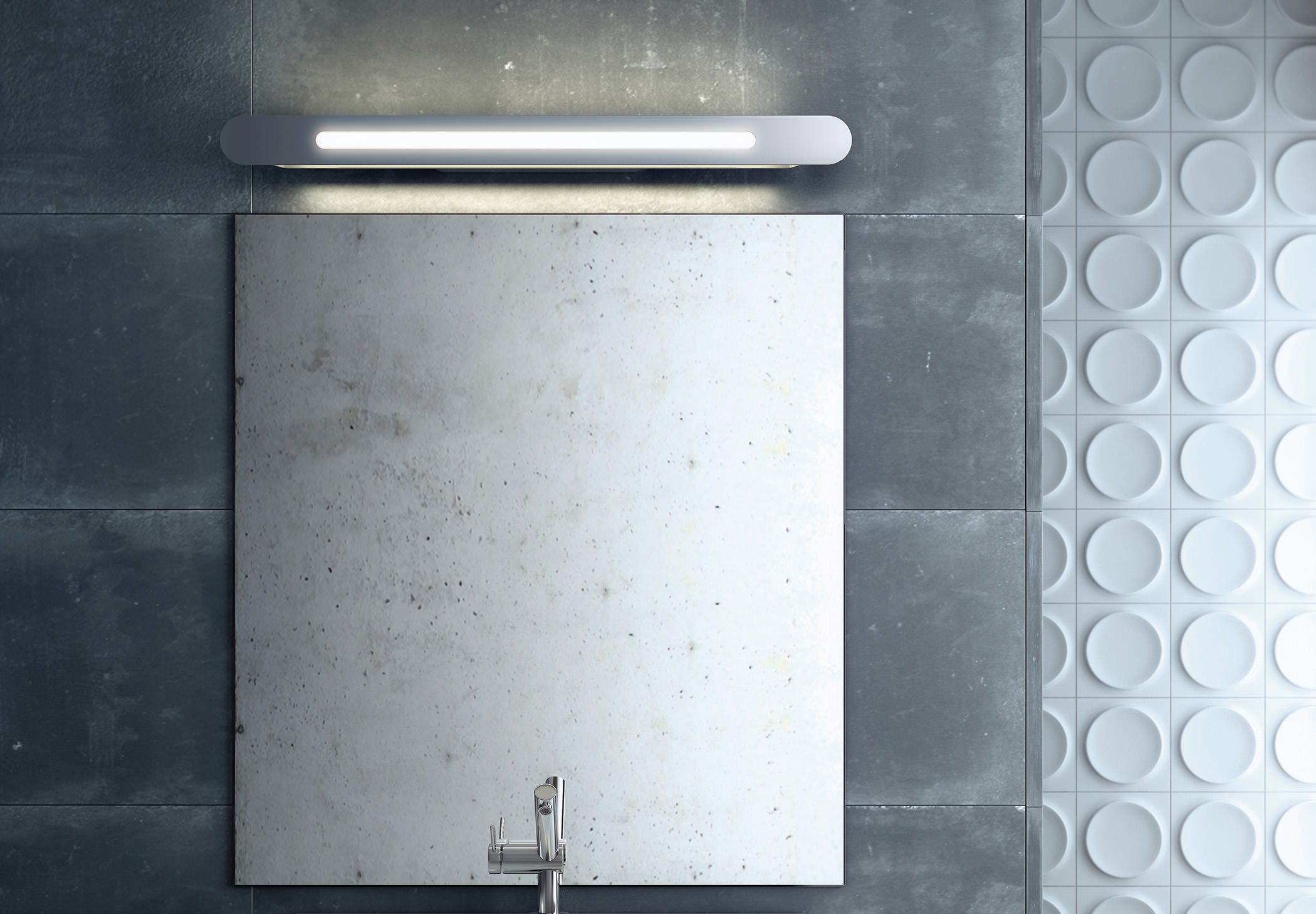 Metallic wall lamp with fluorescent light, compatible with LED bulbs. Front plate with additional cut-out for brighter direct light and acrylic diffuser. It can be mounted vertically or horizontally. The front plate allows laser-cut signage with custom creations including ideograms, logos and texts.