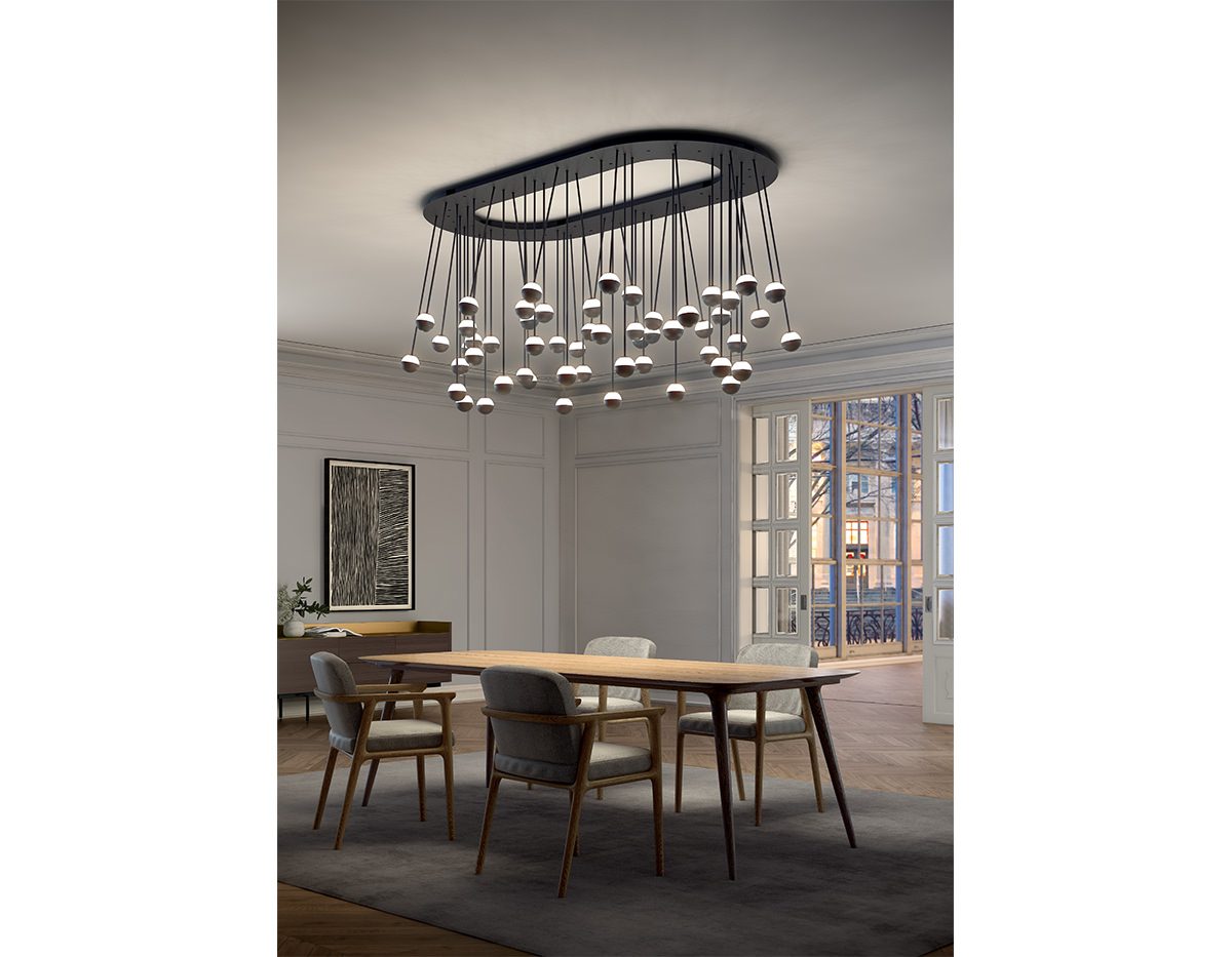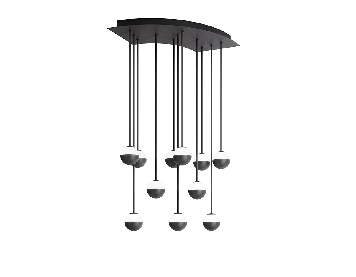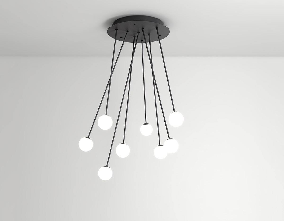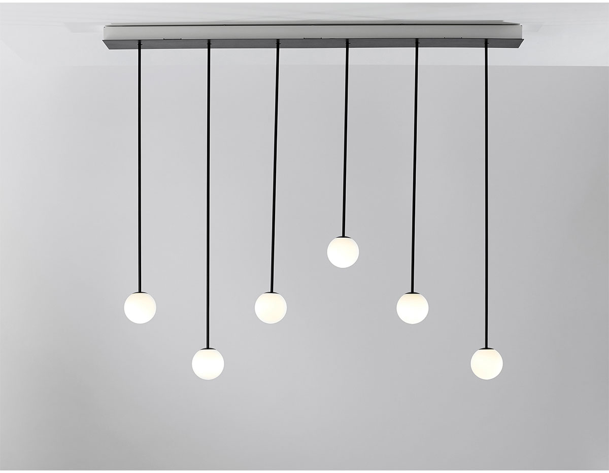 Delicate as a flower and as functional as a pin, Alfi's light emerges from a glass orb, softened with a metal cap. Linear and curved modules can be put together to create suspensions that meander across the ceiling as well as form oval, square or linear configurations. Metal stems on ball joints at the canopy enable easy adjustment.