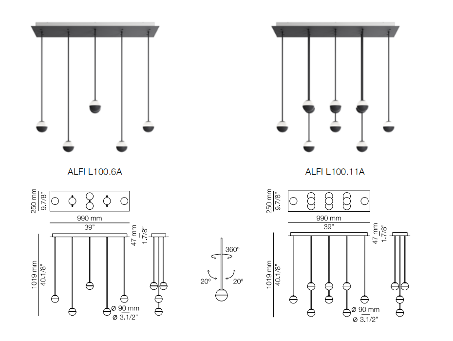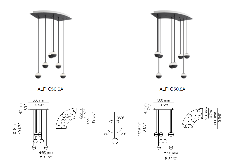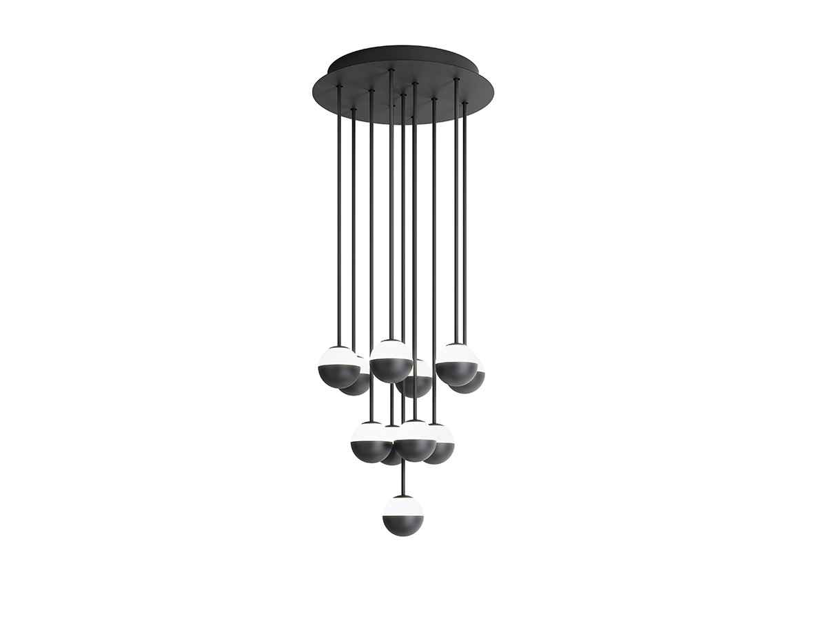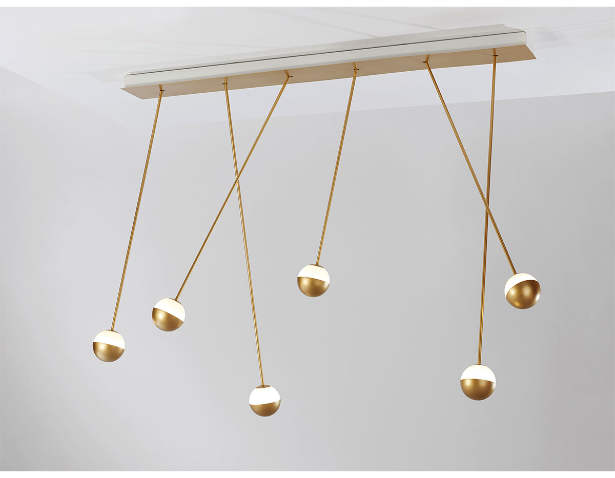 Delicate as a flower and as functional as a pin, Alfi's light emerges from a glass orb, softened with a metal cap. Linear and curved modules can be put together to create suspensions that meander across the ceiling as well as form oval, square or linear configurations. Metal stems on ball joints at the canopy enable easy adjustment.