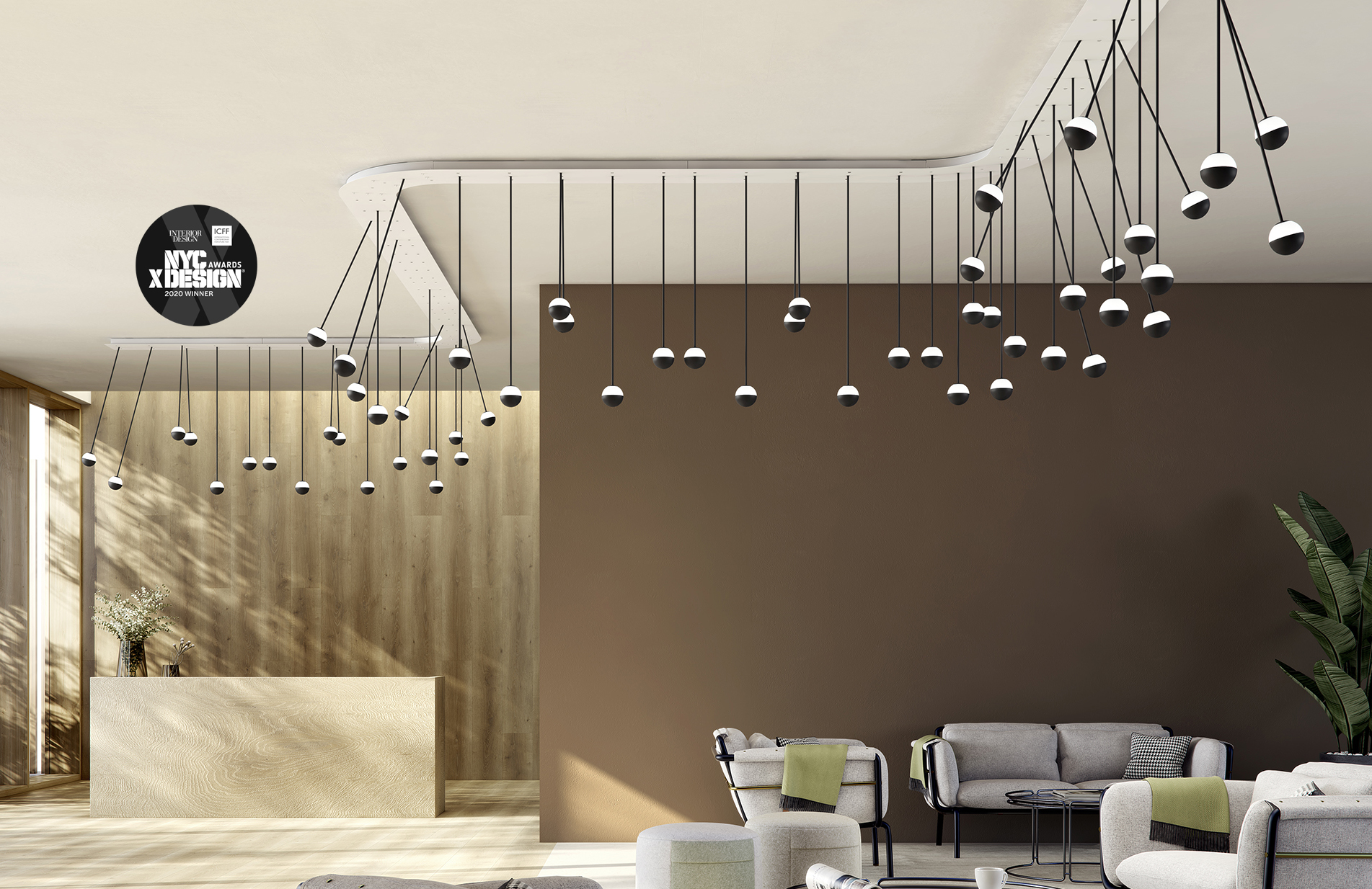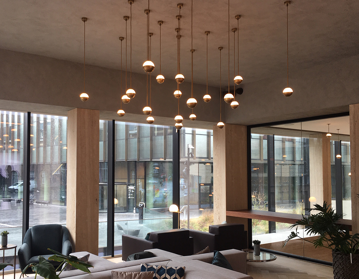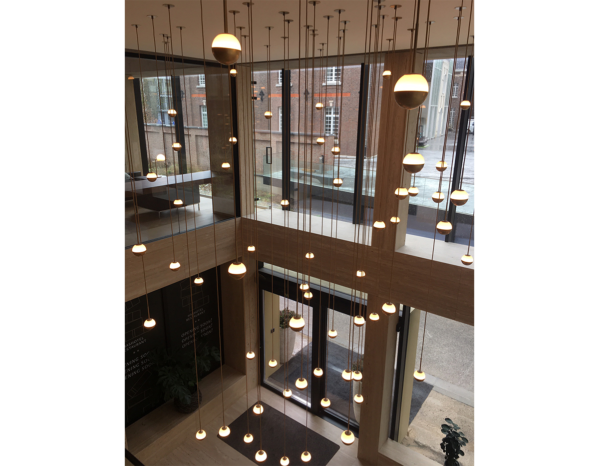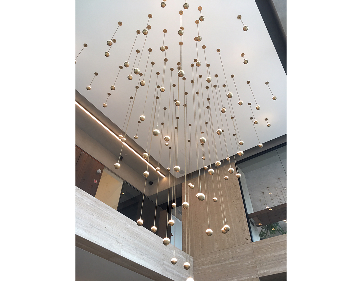 Delicate as a flower and as functional as a pin, Alfi's light emerges from a glass orb, softened with a metal cap. Linear and curved modules can be put together to create suspensions that meander across the ceiling as well as form oval, square or linear configurations. Metal stems on ball joints at the canopy enable easy adjustment.
