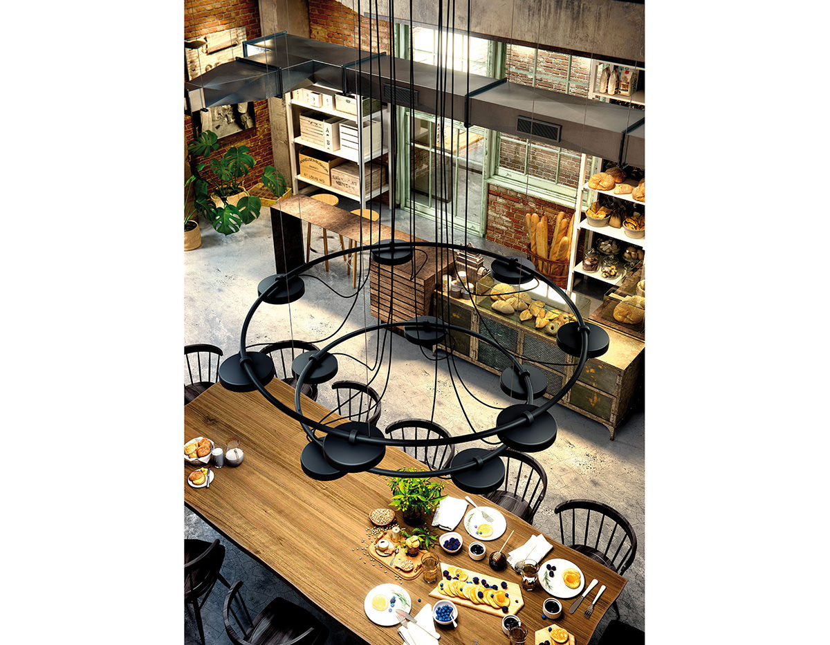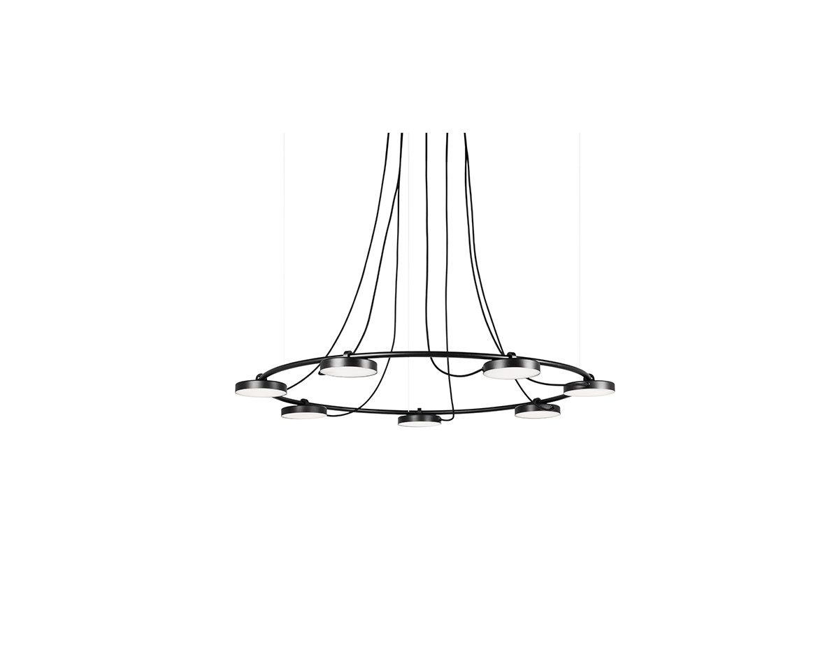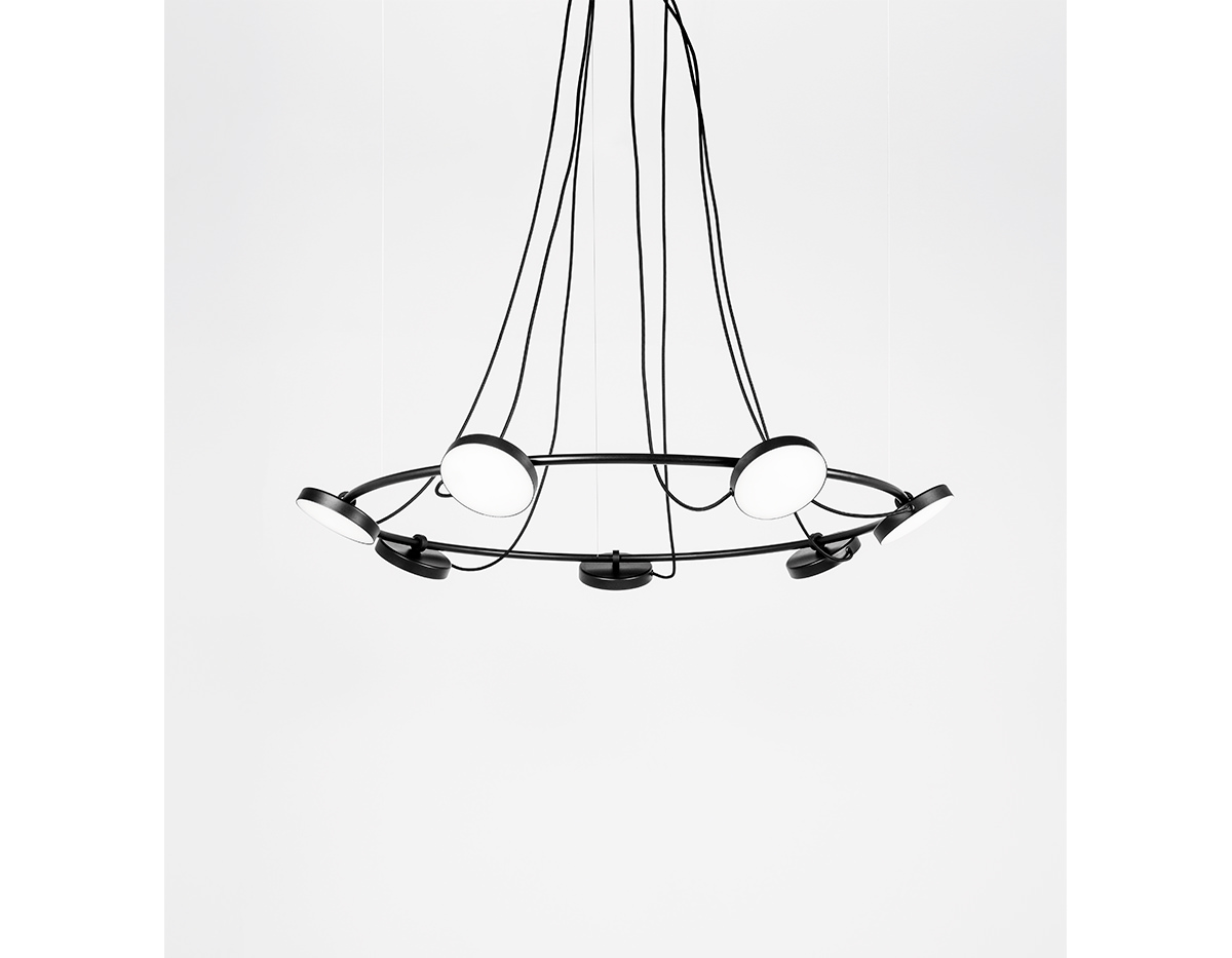 Metallic suspension lamp with circular adjustable heads and acrylic diffusers. The heads rotate up to 106o. The lamp can be mounted with all heads facing up or all heads facing down. Adjustable height and integrated LED dimmable 0-10V. In the composition R40.1M1L each lamp is dimmable independently and each one can be mounted with heads facing up or down.