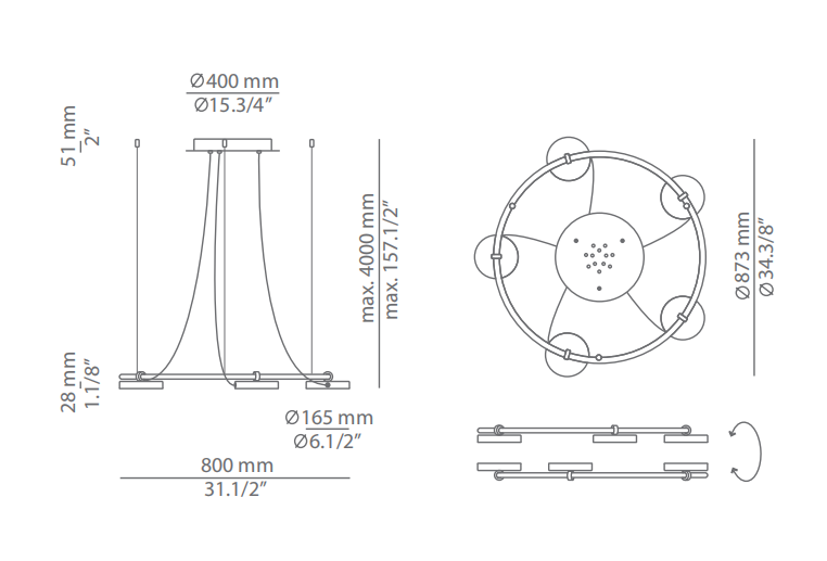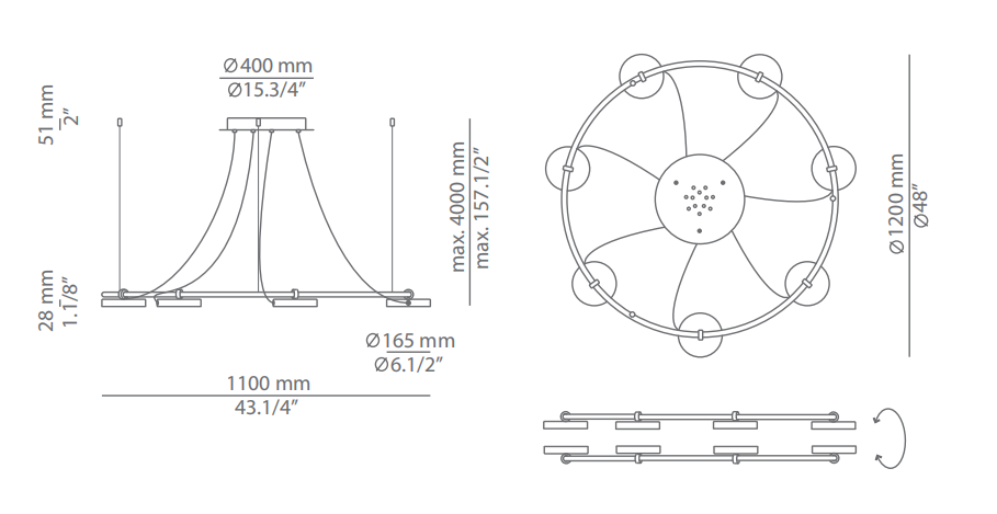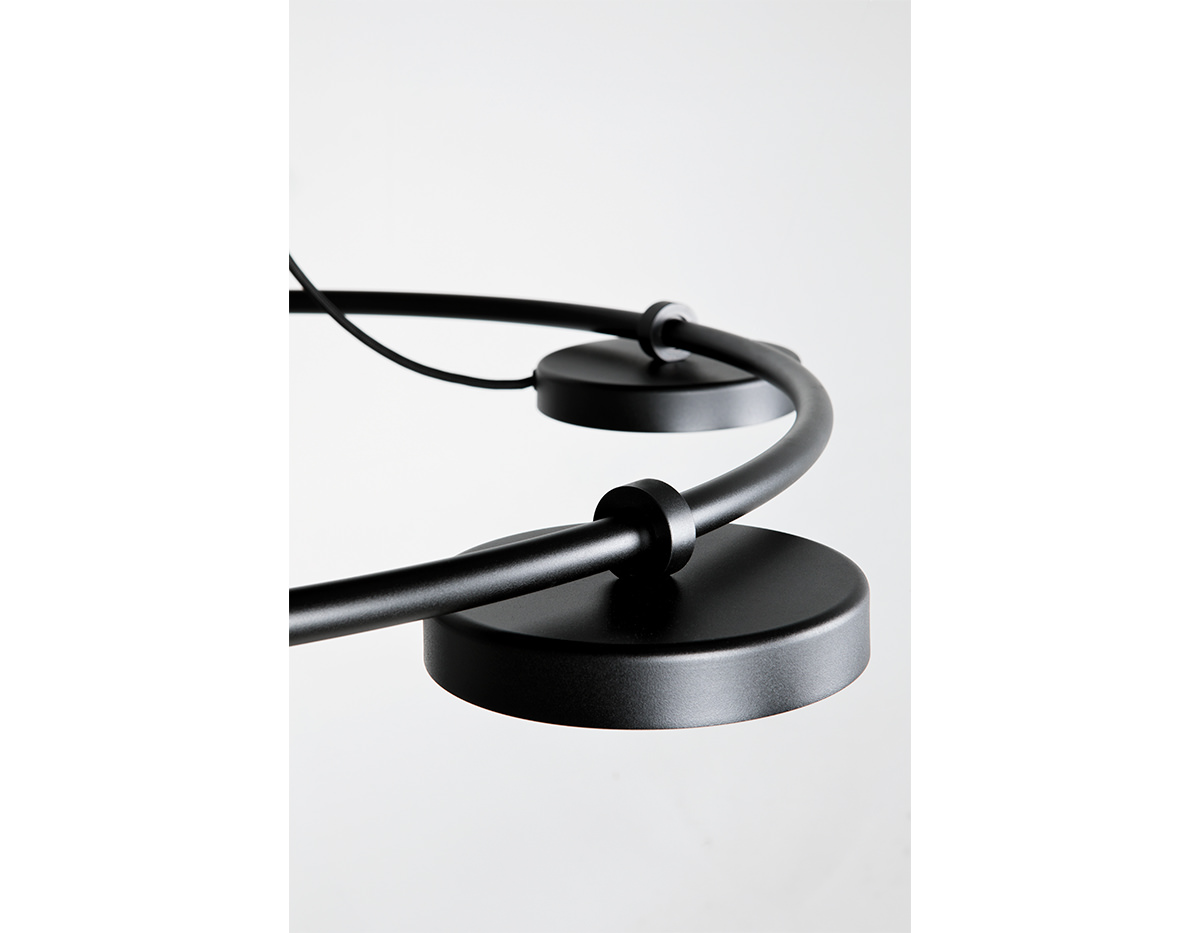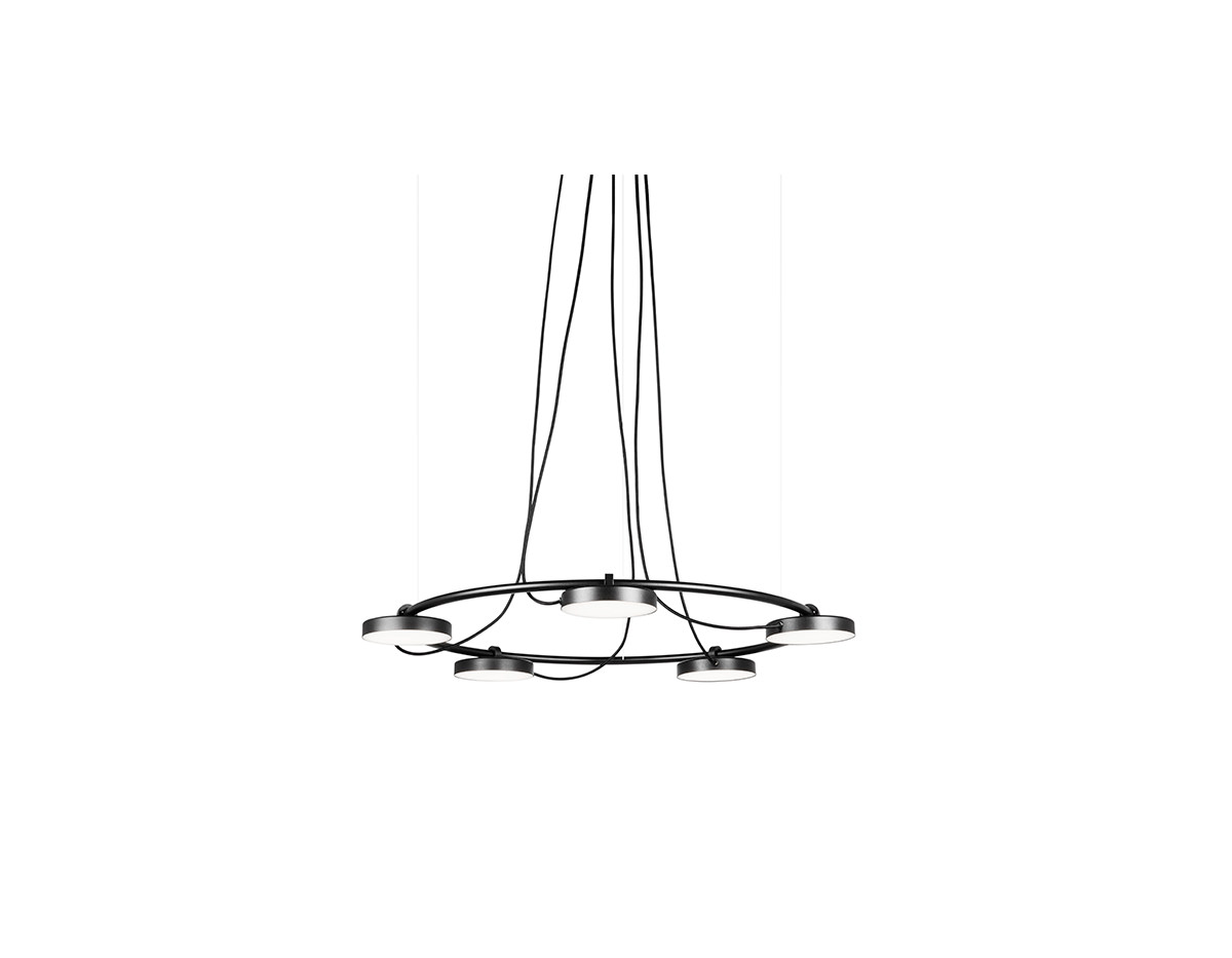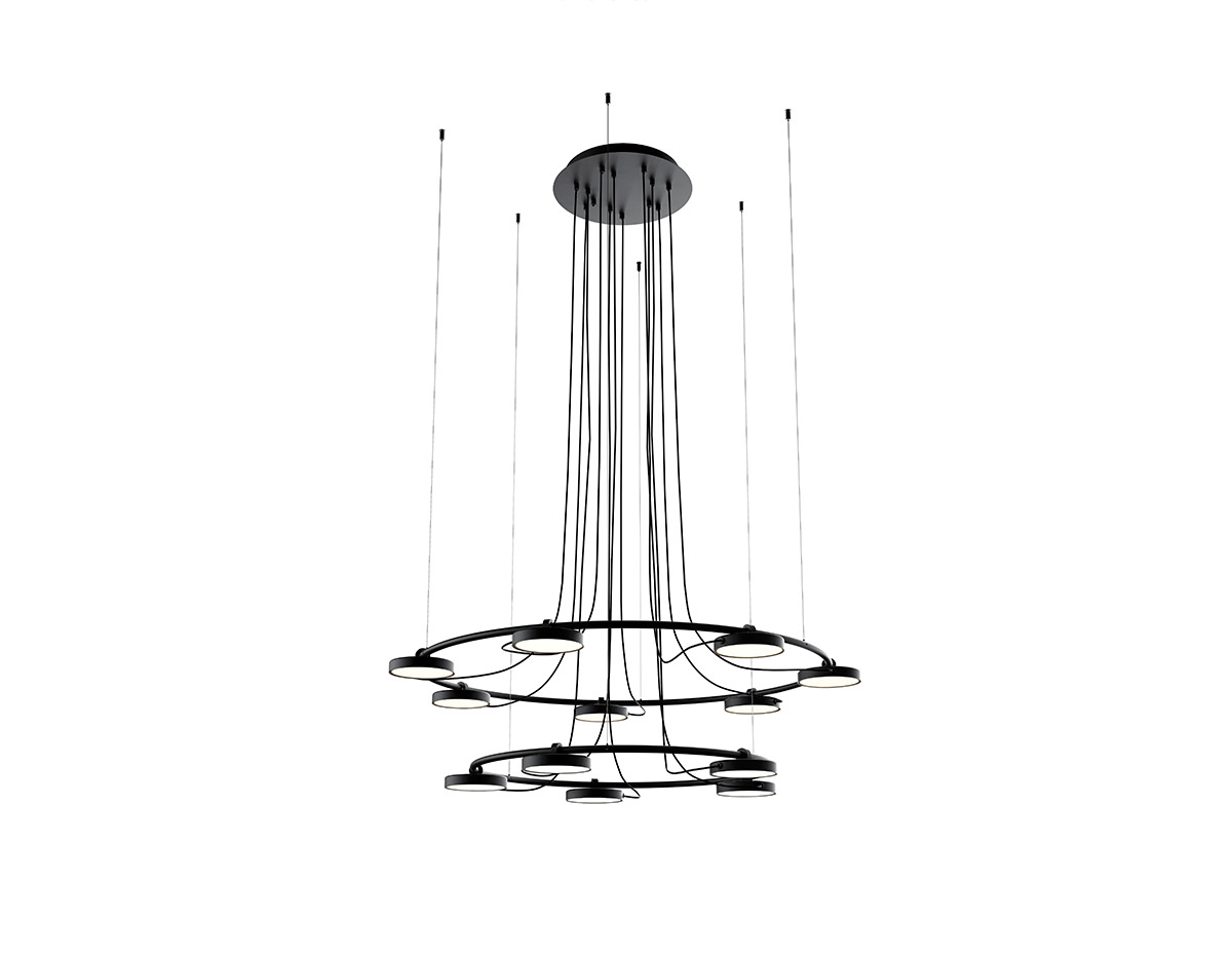 Metallic suspension lamp with circular adjustable heads and acrylic diffusers. The heads rotate up to 106o. The lamp can be mounted with all heads facing up or all heads facing down. Adjustable height and integrated LED dimmable 0-10V. In the composition R40.1M1L each lamp is dimmable independently and each one can be mounted with heads facing up or down.