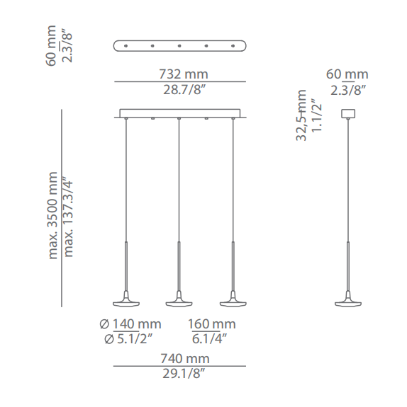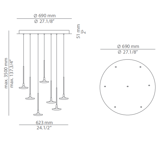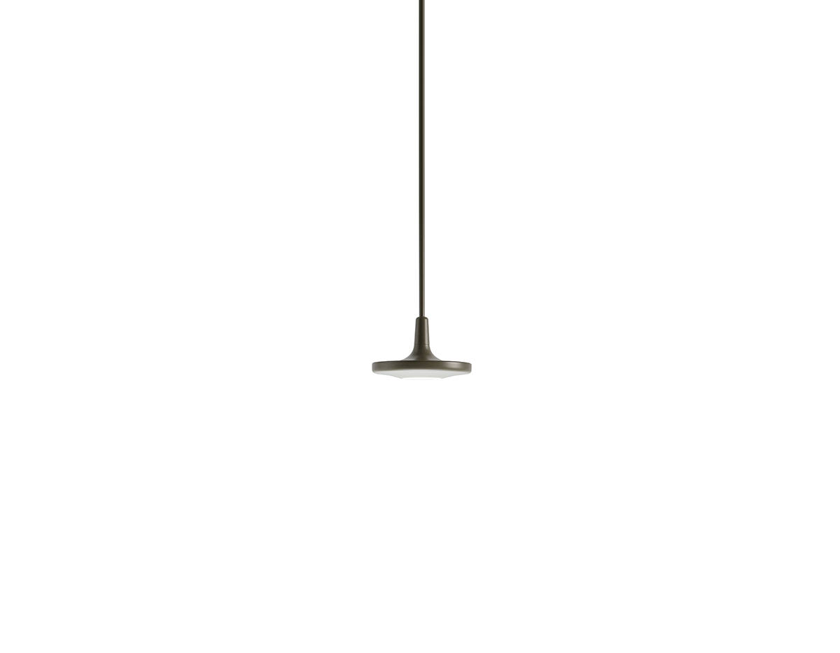Metallic suspension lamp with aluminium shade and integrated dimmable LED. Adjustable height and individual canopy, suitable for creating compositions.