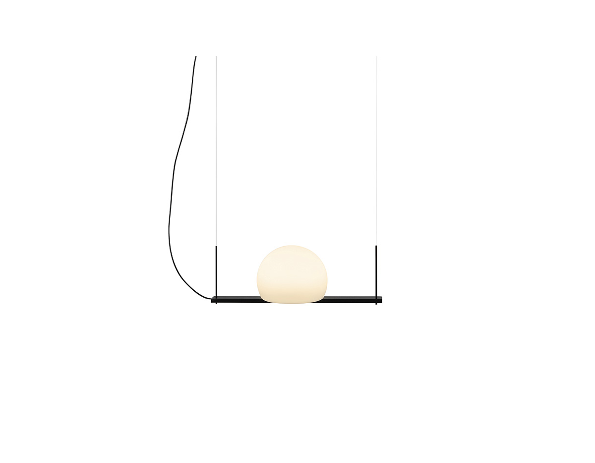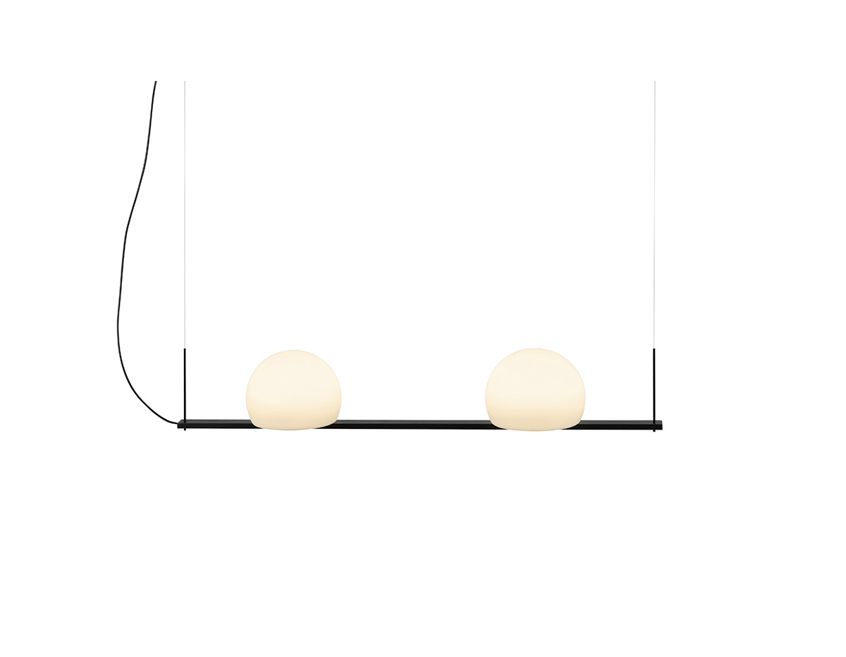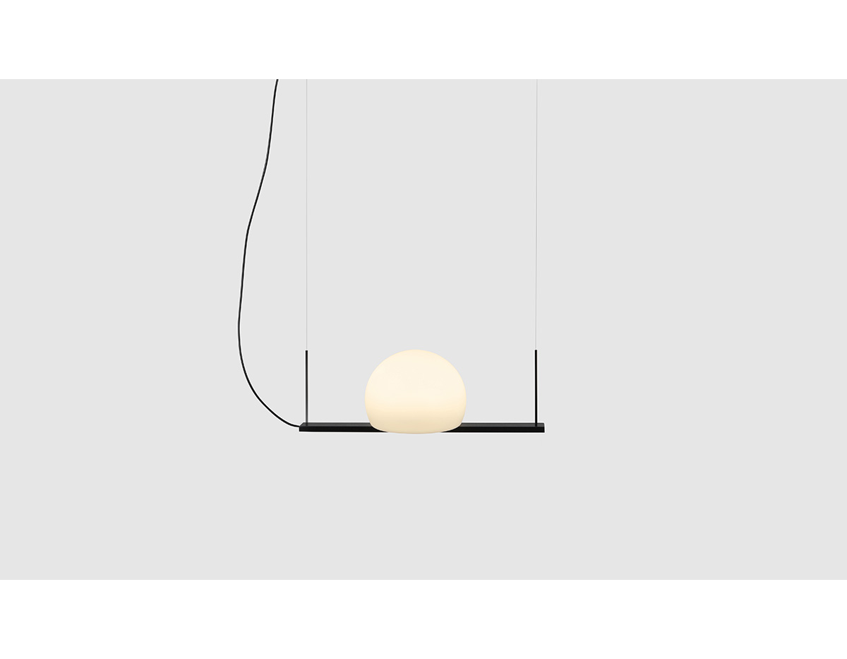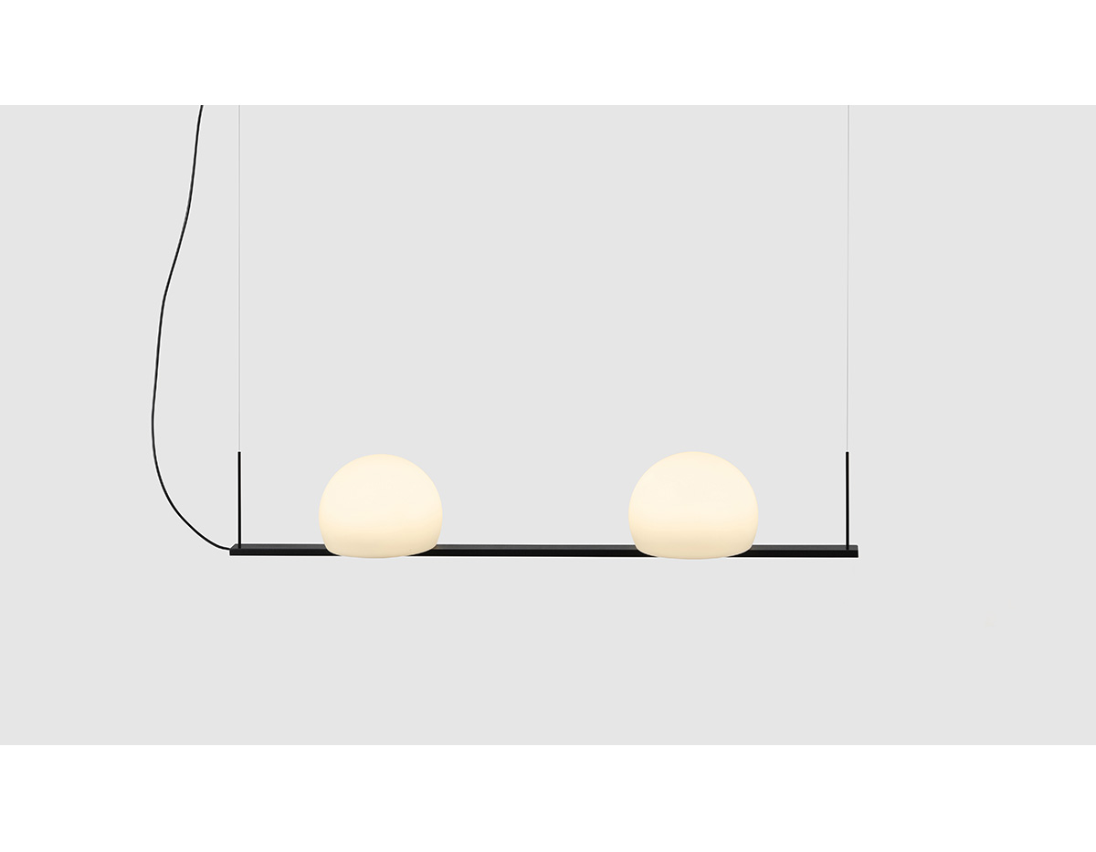 Metallic suspension lamp providing direct and indirect light. Glass shades and integrated dimmable LED. Adjustable height and can be mounted facing upwards or downwards.