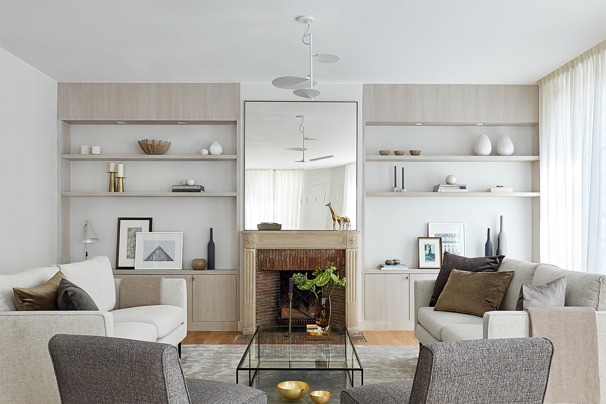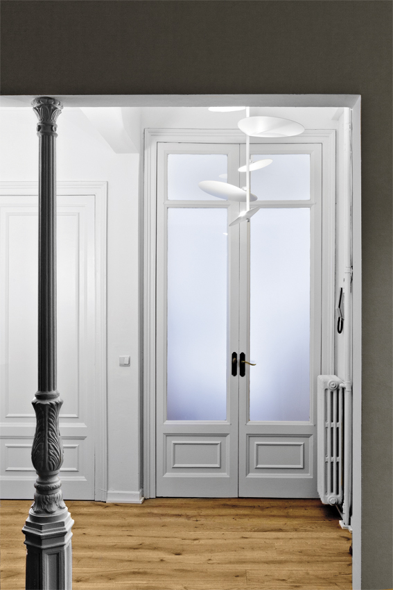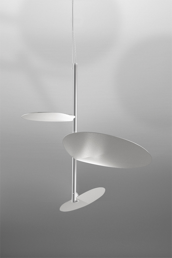 Metallic suspension lamp with adjustable height and integrated dimmable LED providing indirect light.