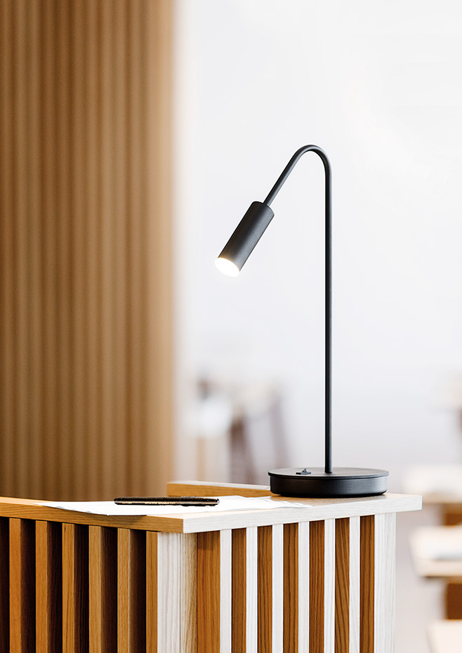 Table lamp with a cylindrical aluminium head, acrylic (PMMA) lens diffuser and integrated LED. On/off switch.