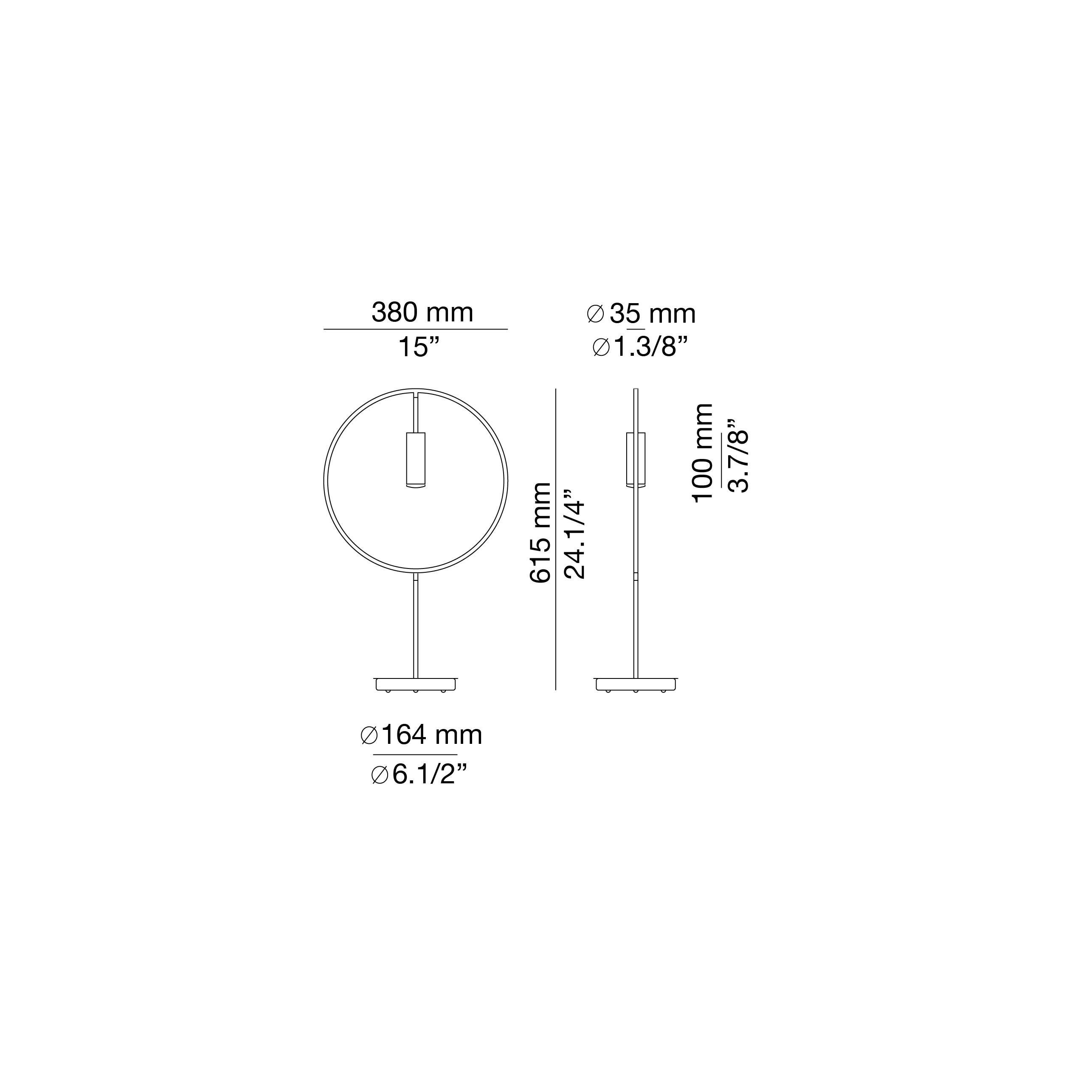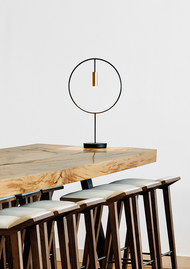 Table lamp with a circular body, cylindrical aluminium head and acrylic (PMMA) lens diffuser. Integrated sensor dimmable LED.