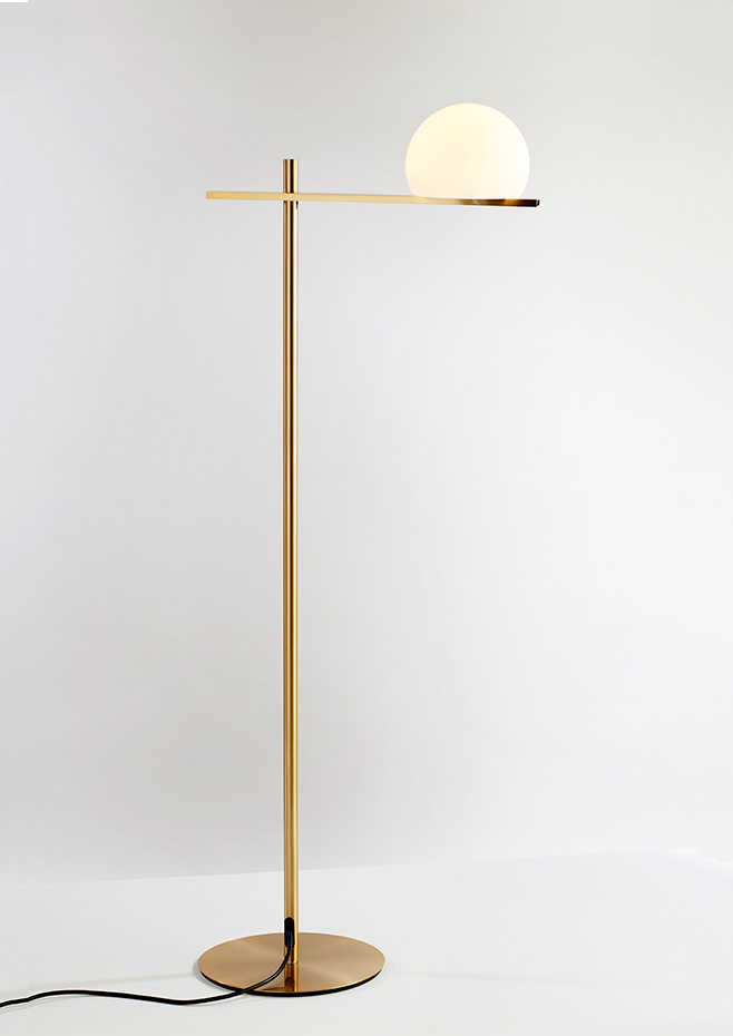 Metallic floor lamp providing direct and indirect light.