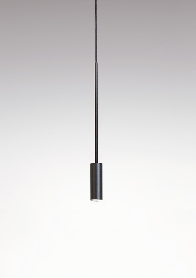 Suspension lamp with metal body, cylindrical aluminium head, acrylic (PMMA) lens diffuser and integrated LED. Adjustable height and individual canopy, suitable for creating compositions.