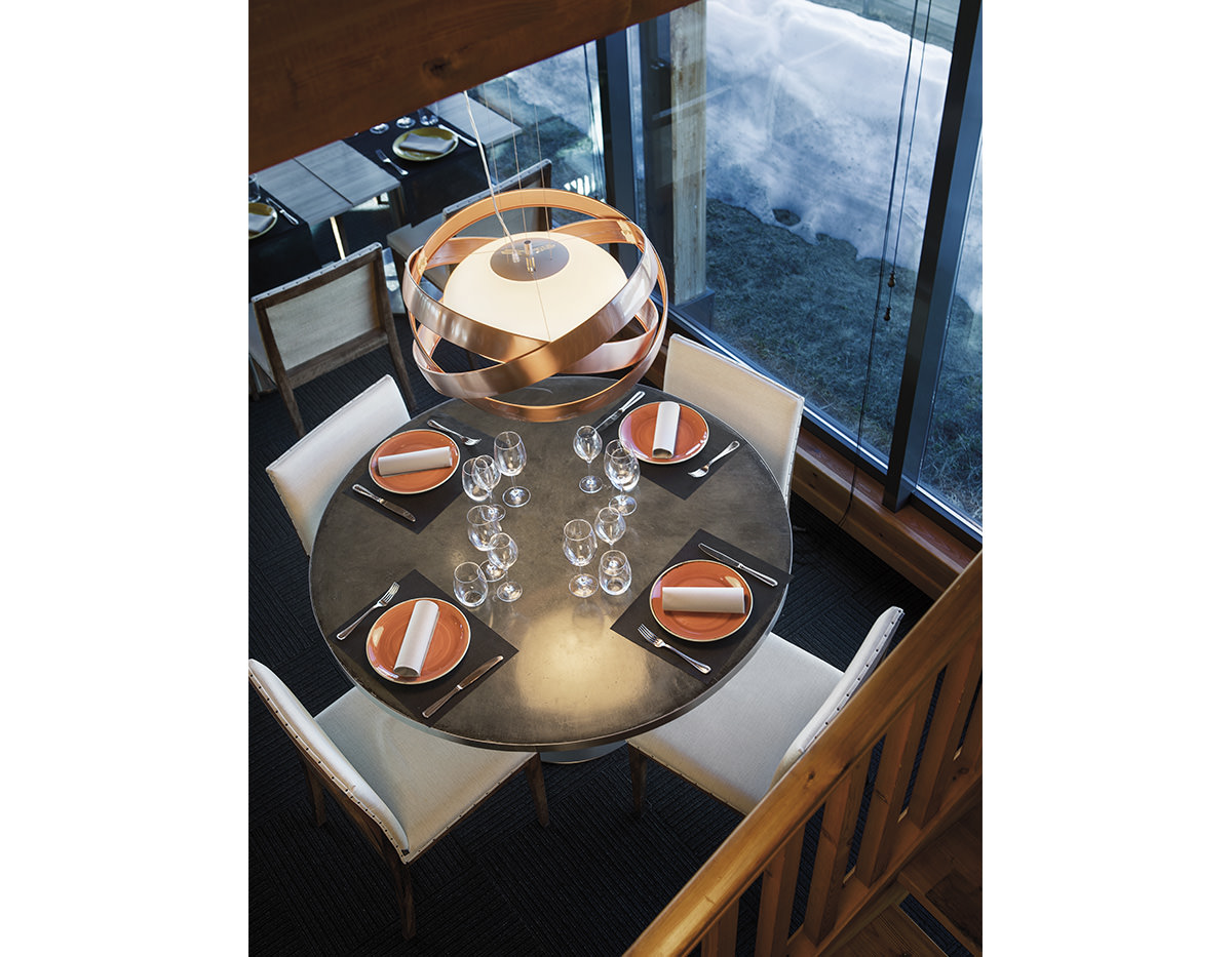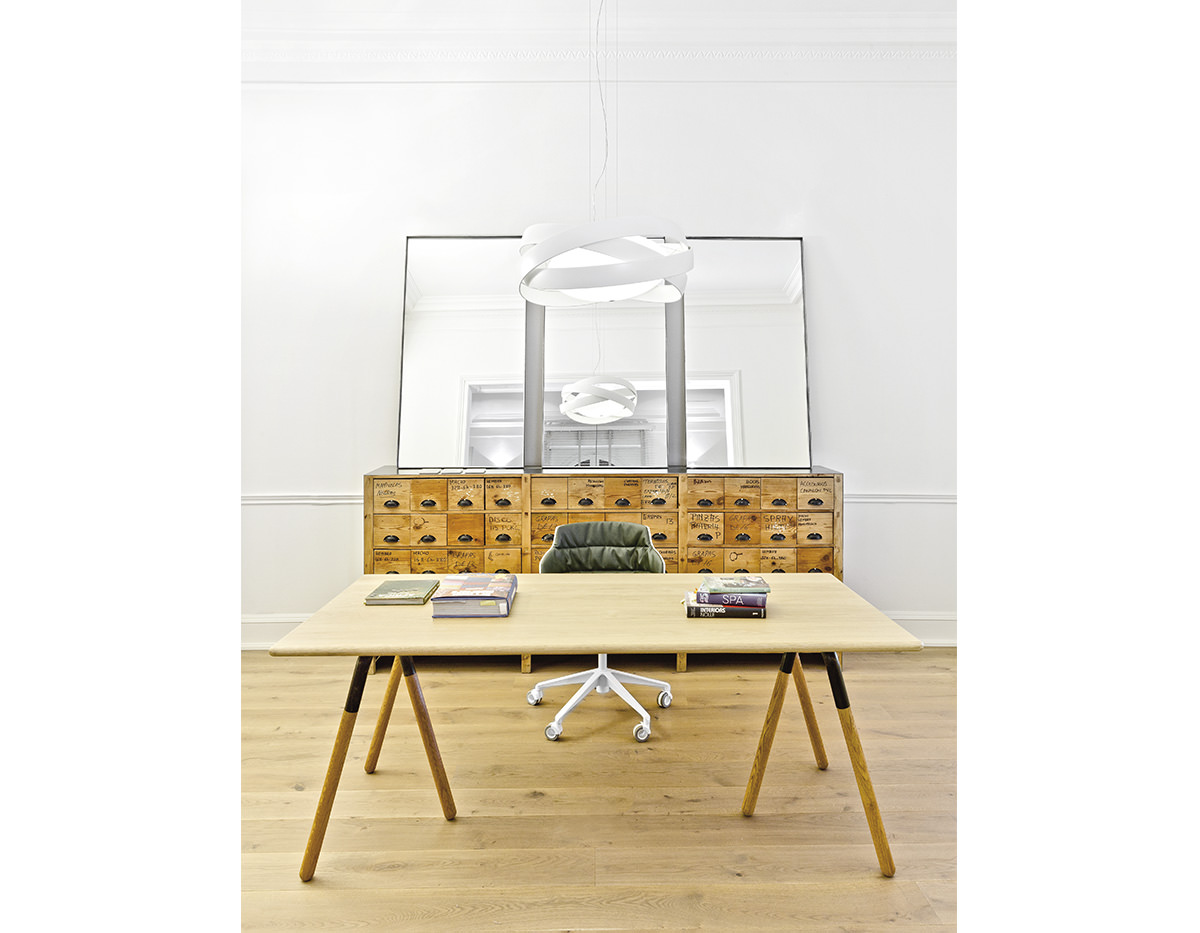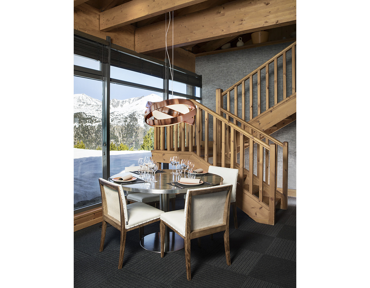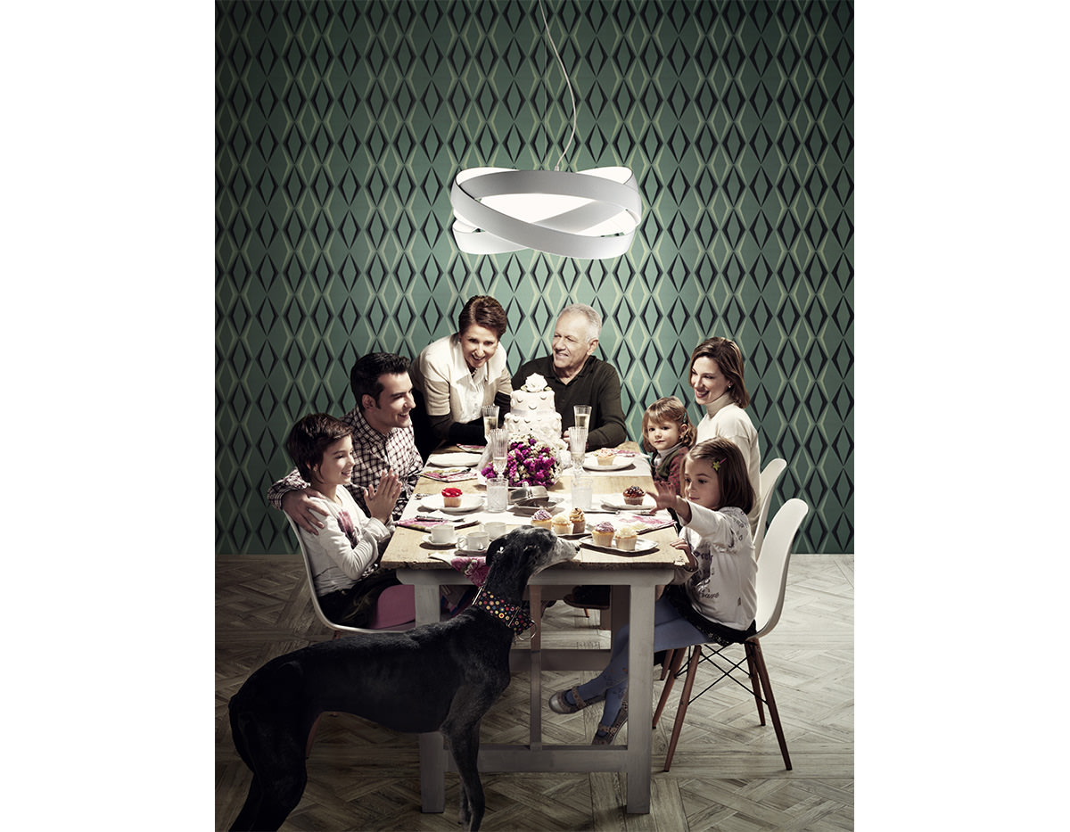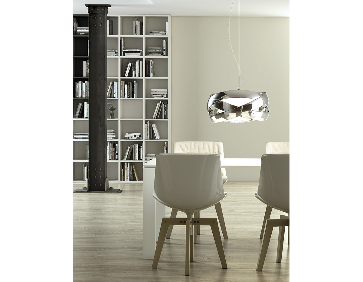 Pendant providing direct and indirect light. Shade is made of a satinated glass and decorative aluminium rings. Adjustable height.