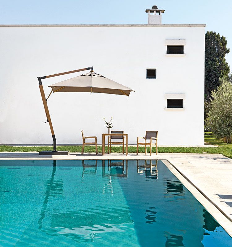 Supported by a natural wood post, with geometrically symmetrical lines, Holiday is a practical and essntial accessory for outdoor spaces.