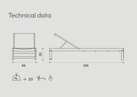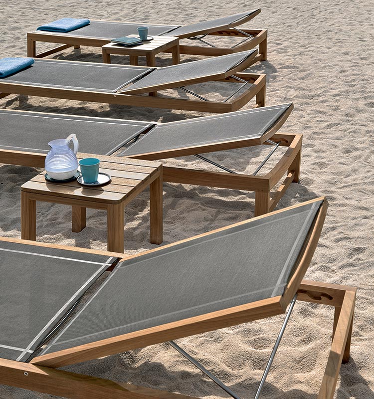 The solid and rational wood frame of the Sand sun lounger, with adjustable back, accommodates, in the lighter solution, convenient waterproof fabric or, in the version in teak throughout, a soft mattress.