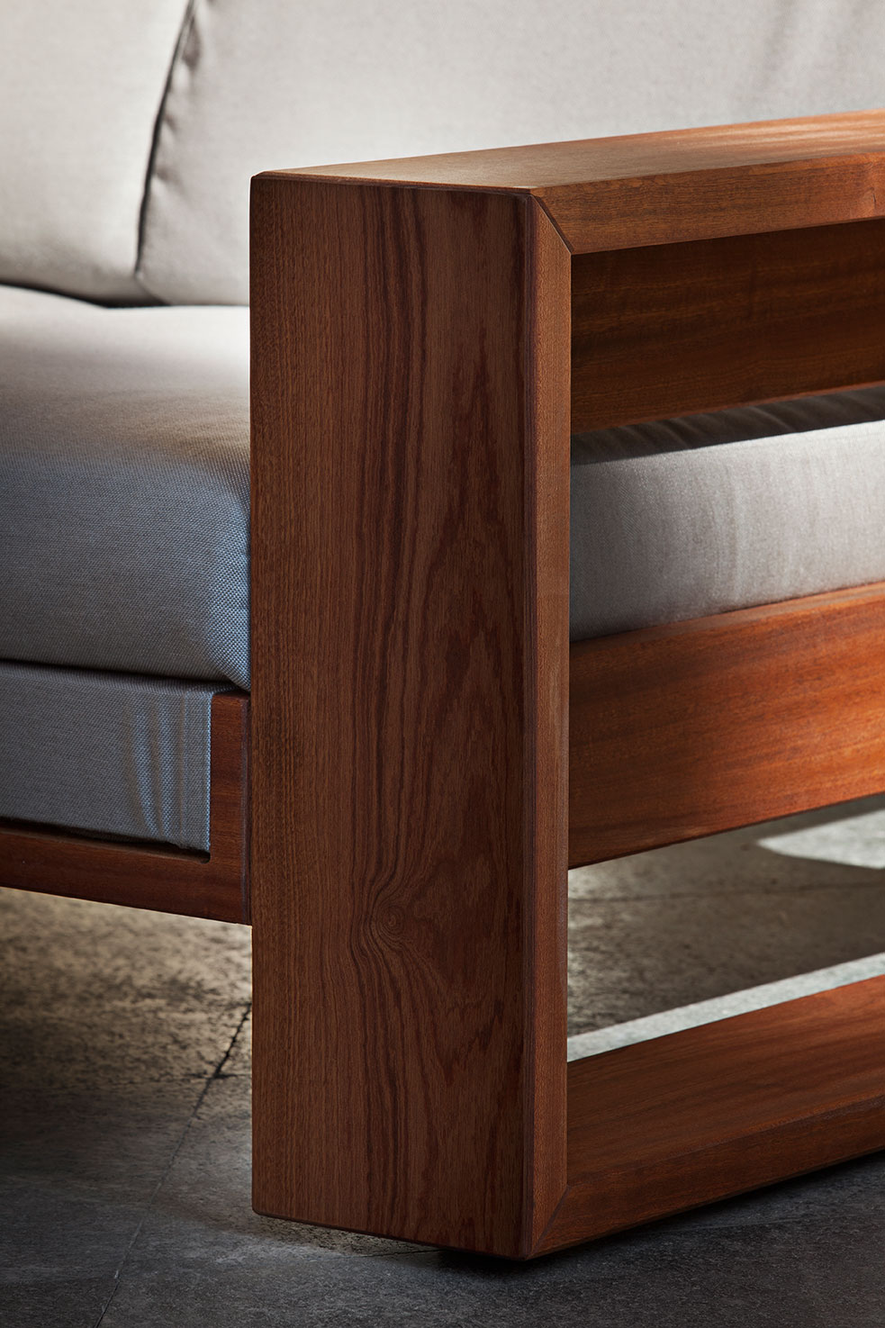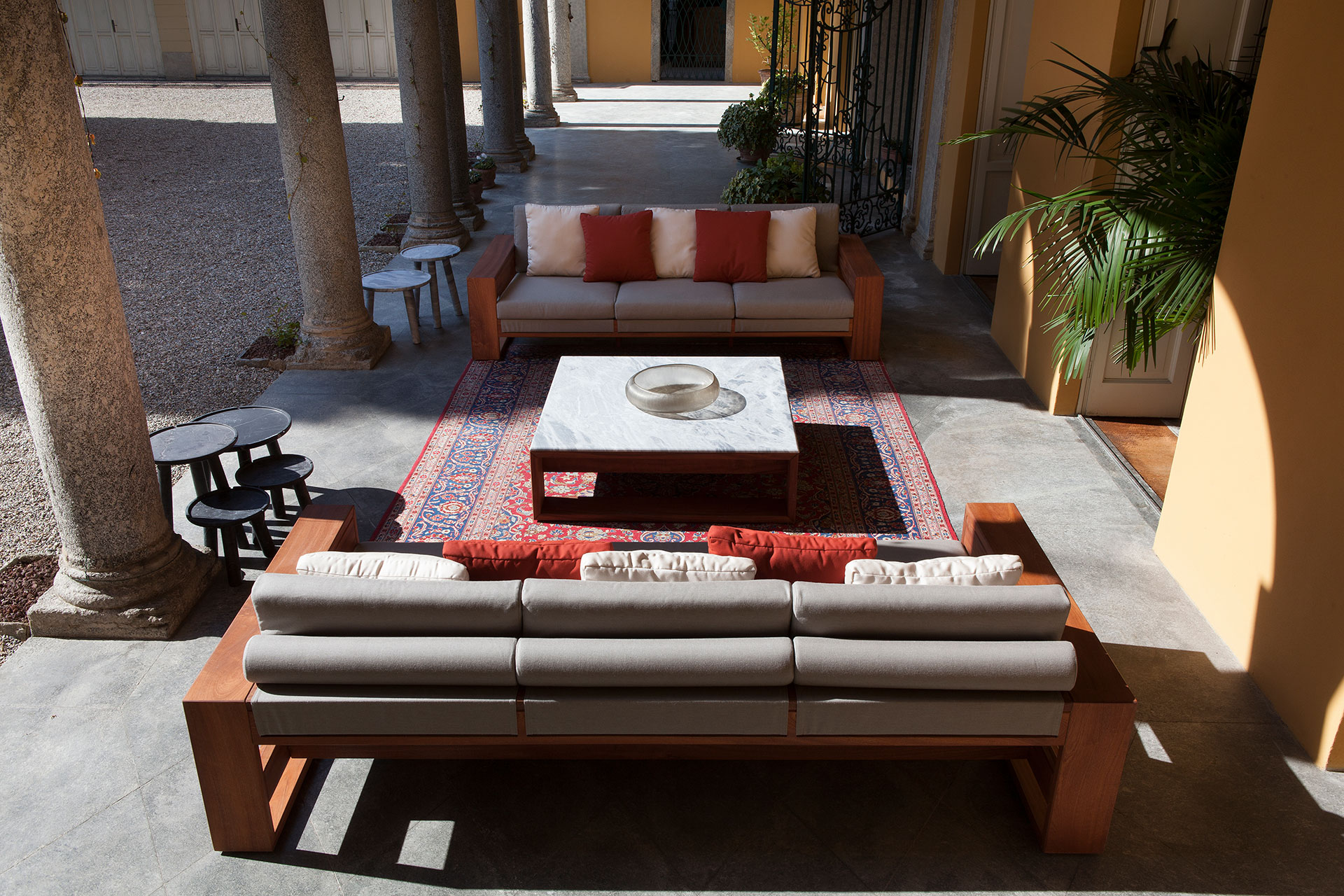 Strict geometries and precious materials: the Bellagio Collection is a clear homage to a majestic design, able to characterize every environment with a strong identity. The closed cell structure is made entirely of Sapelli mahogany and upholstered in nautical fabric, available in every colour as per sample card.