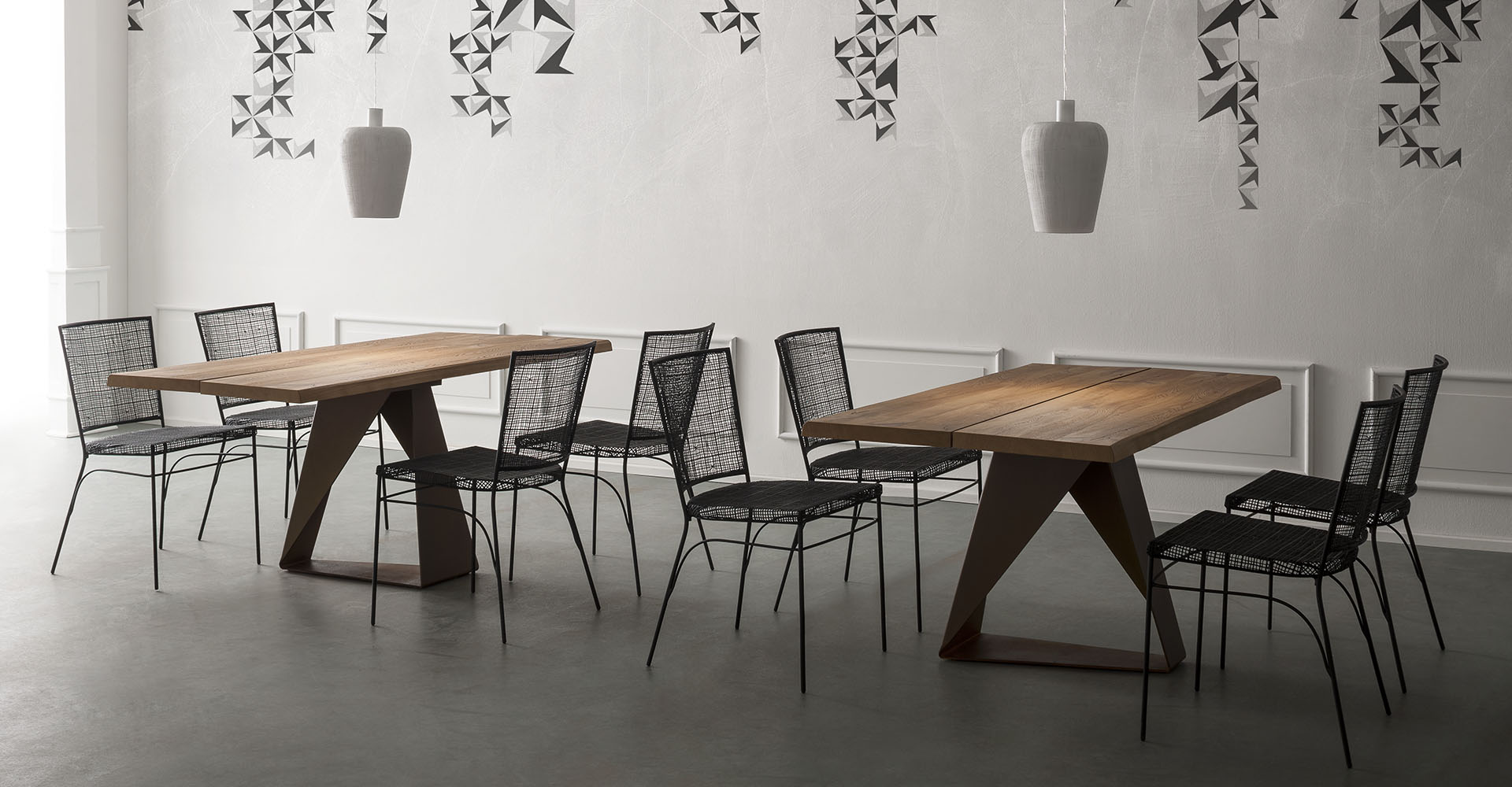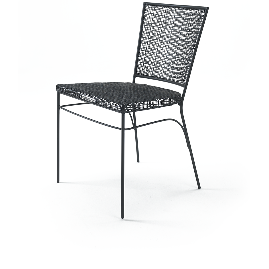 A dense interwoven iron weave supported by a light structure of solid iron rod gives life to the characteristic optical illusion of the GIULIA chair. Practical and light, but at the same time of great presence, this seat is well suited to industrial, public or private scenario, between wood and metal.