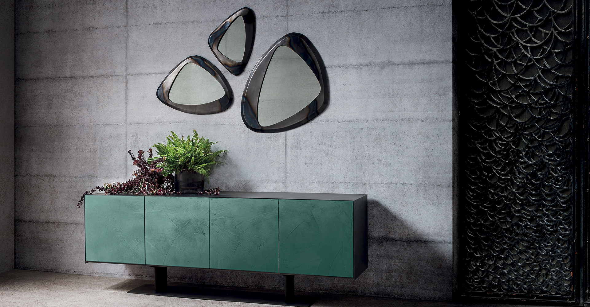 Questo tris di specchi è adatto ad esempio ad un moderno ingresso, un soggiorno o uno studio privato. La particolare forma di TERNO esprime un'avvolgente movimento attraverso la lamiera modellata dai delicati bordi triangolari morbidi e stondati. La finitura specchiata è ottenuta tramite l'utilizzo di fiamma ossidrica, un metodo di lavorazione artigianale distintivo, che eleva il valore artistico di questo pezzo. Sono inoltre disponibili tutte le varianti di finiture metalliche satinate e diamantate come il nickel, il bronzo, l'ottone e il piombo oltre al ferro fiamma ossidrica e il verderame satinato.