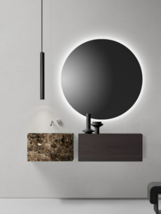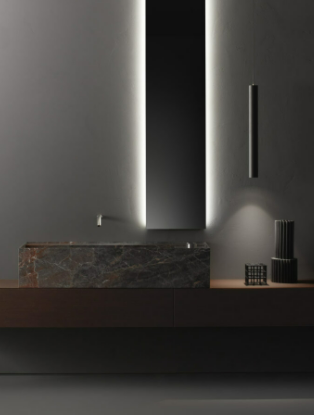 Mobile bagno a parete con cassetto, larghezza da 60cm a 160cm e altezza 36cm Lavabo a parete modello Minimum con piano da appoggio integrato sul lato sinistro, larghezza 80cm, profondità 45cm e altezza 36cm. Lavabo disponibile in cemento e marmo con copripiletta nella stessa finitura. Mobile con lavorazioni a 45° su frontali e corpo. I cassetti sono completamente estraibili e sono disponibili con maniglie opzionali a gola o premi apri.