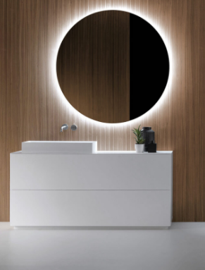 Mobile bagno porta lavabo con cassetto, top integrato e lavabo da appoggio, dimensioni da 140cm a 160cm. Piano integrato in Fenix con taglio a 45°. Lavabo in Cristalplant? Bio Active opaco modello Ciotola con copri piletta in Cristalplant? Bio Active, disponibile nelle versioni centrato, a destra e a sinistra del mobile. Basi del mobile con frontali e fianchi a 45°. I cassetti sono completamente estraibili e sono disponibili con maniglie opzionali a gola o premi apri.
