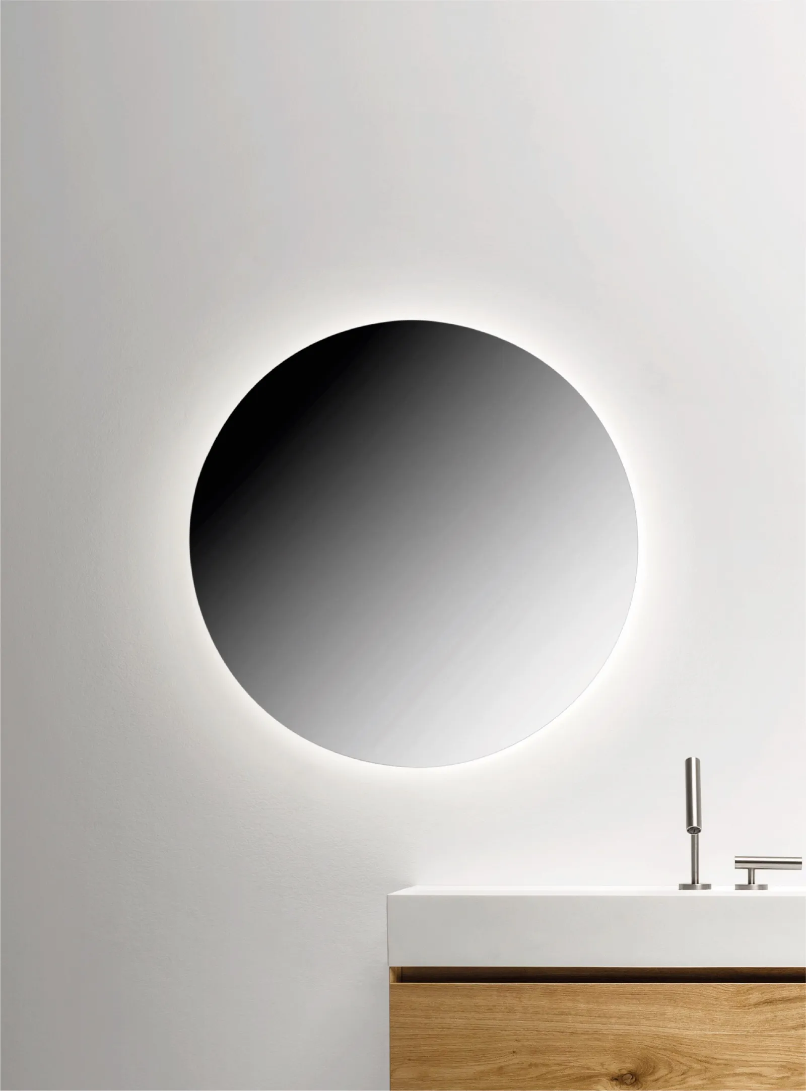 Specchiera bagno tonda con bordo in acciaio a filo lucido con spessore 2,5cm e diametro da 45cm a 120cm. Specchi su misura realizzabili fino a un massimo di 1,5 mq.