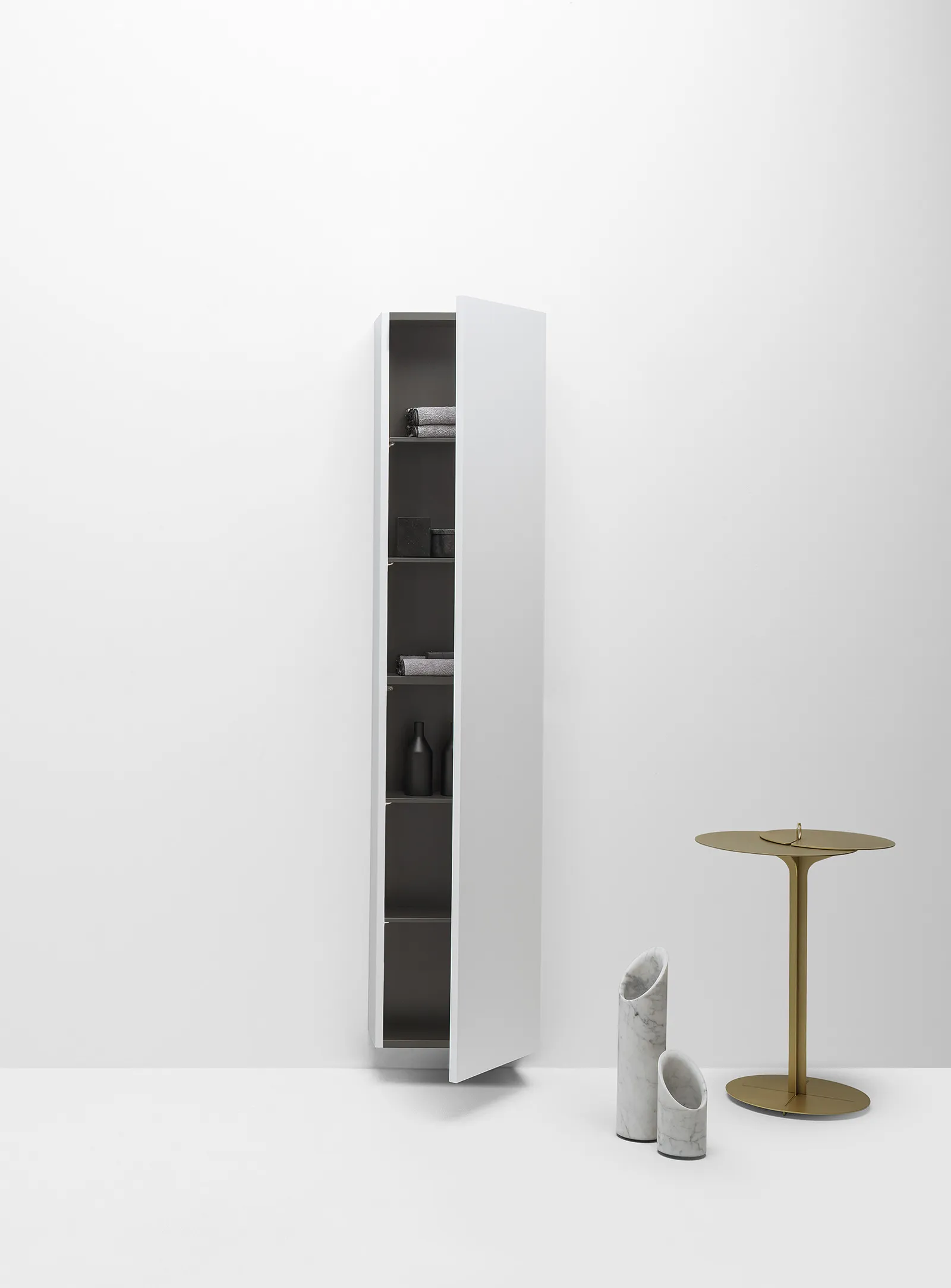 Mobile bagno porta lavabo con cassetto, top integrato e lavabo da appoggio, dimensioni da 140cm a 160cm. Piano integrato in Fenix con taglio a 45°. Lavabo in Cristalplant? Bio Active opaco modello Ciotola con copri piletta in Cristalplant? Bio Active, disponibile nelle versioni centrato, a destra e a sinistra del mobile. Basi del mobile con frontali e fianchi a 45°. I cassetti sono completamente estraibili e sono disponibili con maniglie opzionali a gola o premi apri.