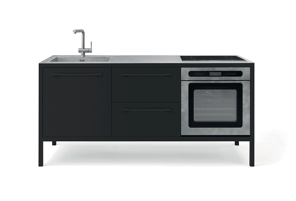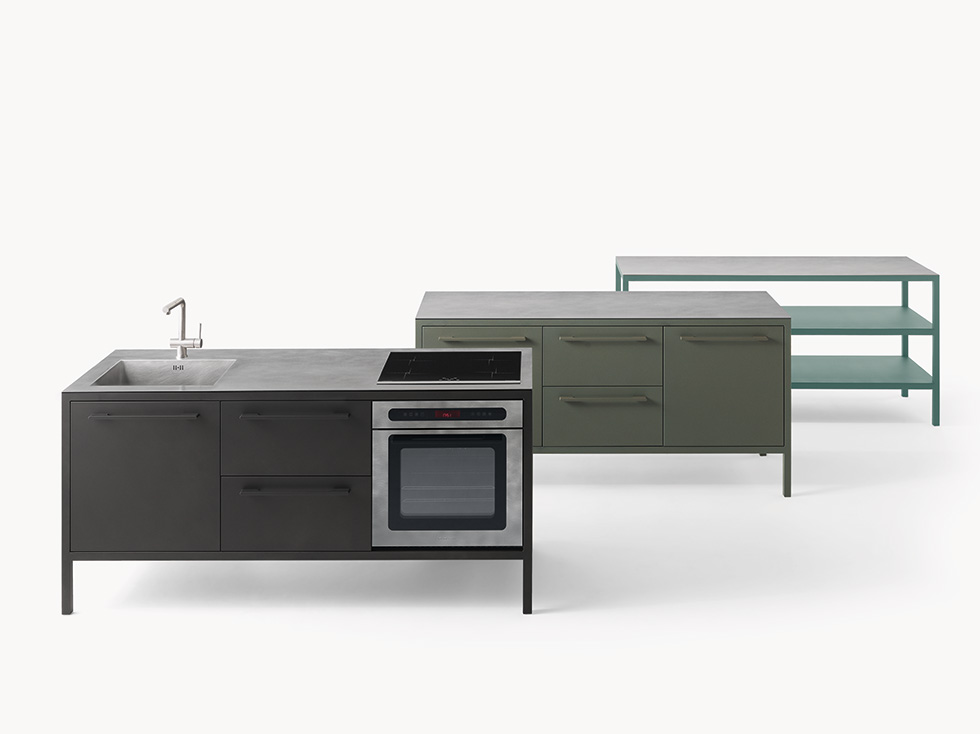Le cucine Frame sono proposte a 2 o 3 moduli, con top in acciaio Barazza o in Fenix NTM. L’acciaio – in finitura Vintage o satinata da 4 mm – è abbinabile con tutte le finiture Fantin, mentre i top in Fenix NTM sono proposti con telai nelle finiture Ultra-matt perché esattamente corrispondenti per colore, opacità e morbidezza al tatto. è così possibile ottenere cucine monocromatiche dalle solide strutture in metallo Fantin e con top resistenti e ripristinabili.