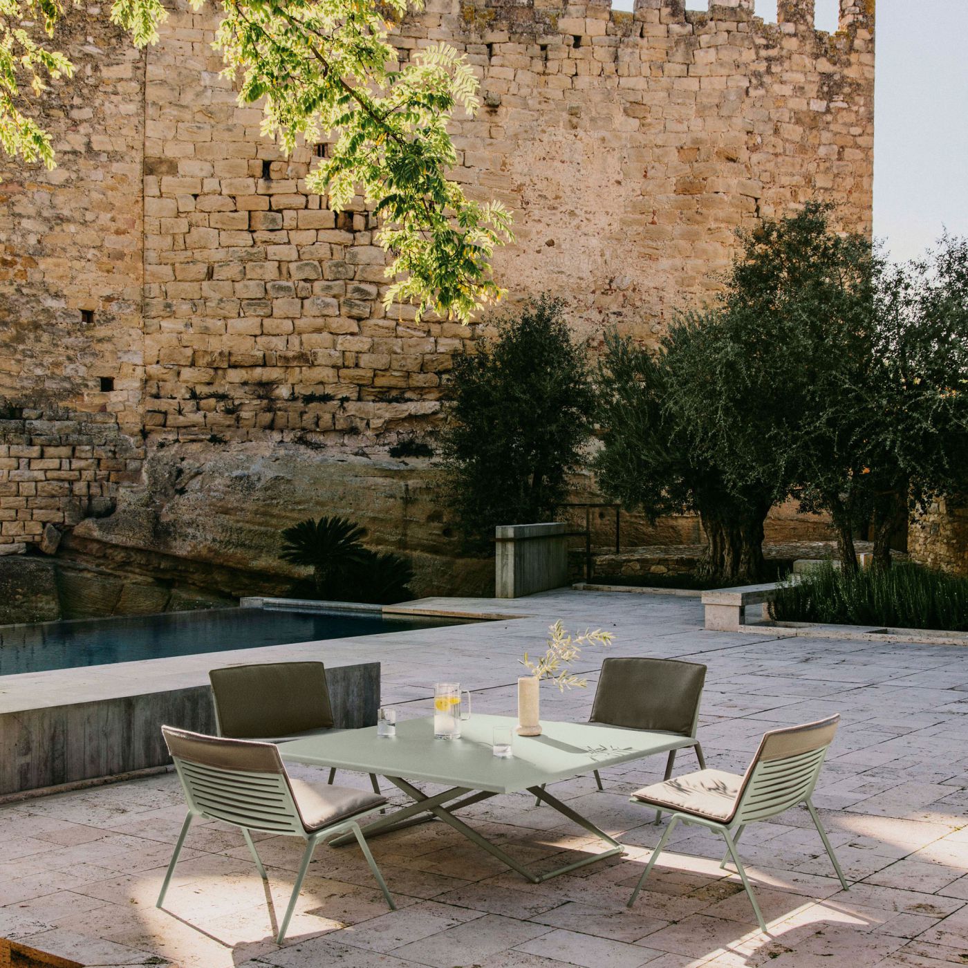 The encounter between the solidity of the material and the light weight of the shapes. In the Zebra collection, the die cast aluminium is structured by removal, which with a game of blocks and voids, illuminated by the sun, designs mesmerising geometric shapes on the ground. For even greater comfort, cushions are available for the seat and backrest, covered with fabrics which are suitable for outdoor use: resistant to water, to stains, to UV rays, and to abrasions.