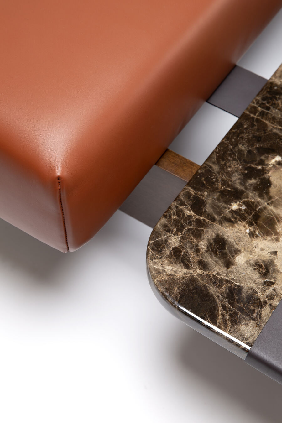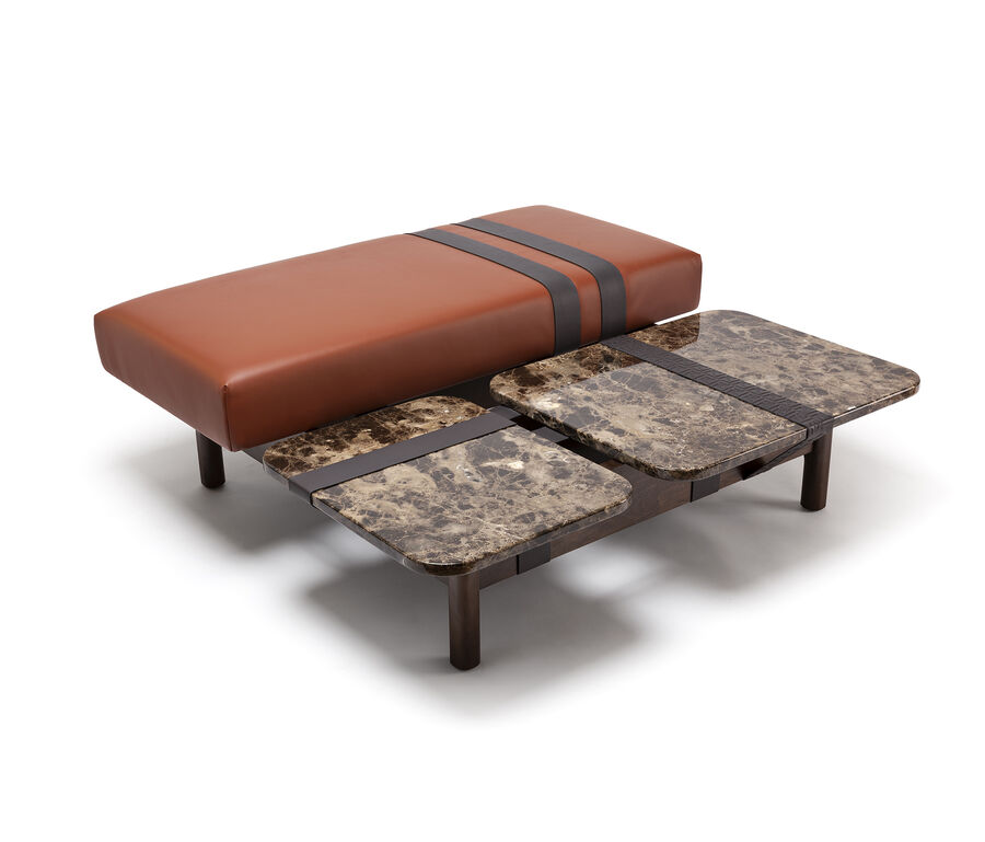 The Ribbon table, conceived by Atelier O?, combines design and functionality in a striking fusion of elegant natural stone, a padded seat in fabric or leather, and a solid wood base. The straps that are normally used in furniture making as part of the internal structure, here take on a visible, decorative role. A striking contrast of materials and a bold structural pairing create a piece that is designed to respond to a modern idea of conviviality.