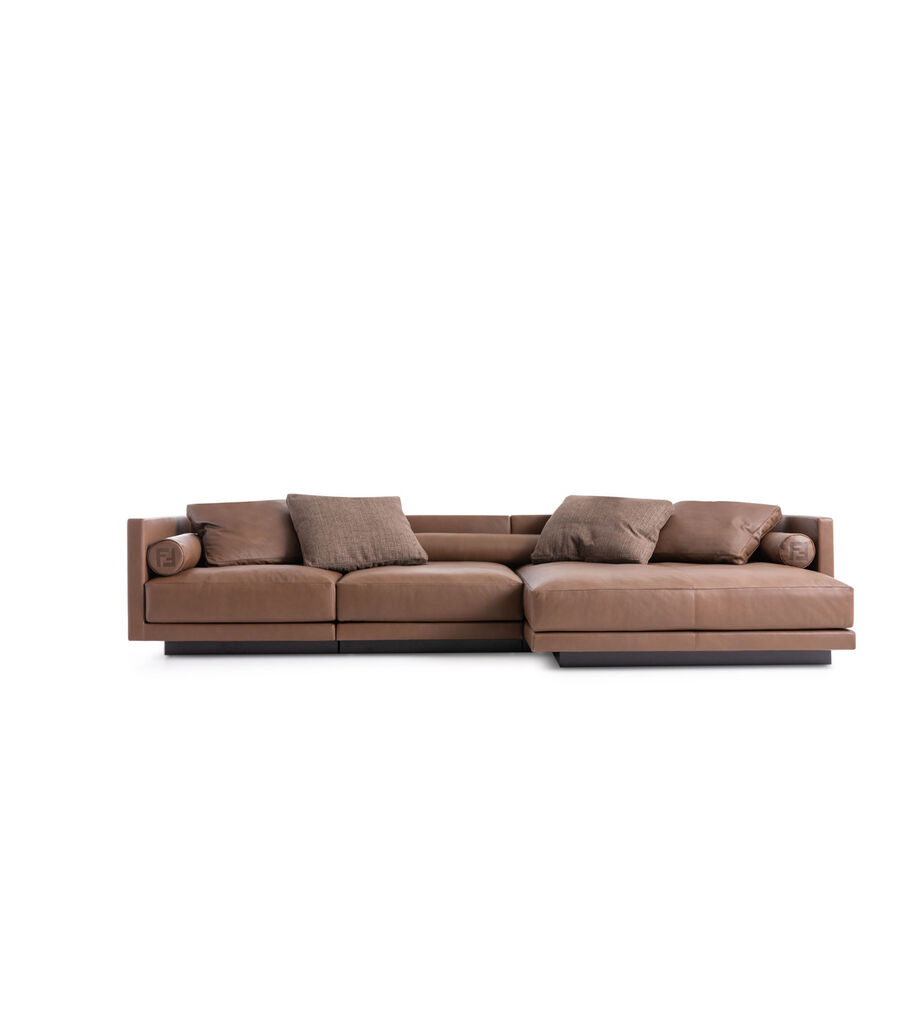 The Taiko sofa, designed by Piero Lissoni, stands out for its generous volumes and deep, comfortable seating. Exuding personality, the piece has a linear, lightweight expression, underpinned by a modular design that will easily fit multiple landscapes. Refined finishing touches nod to Fendi's iconic leather craftsmanship – notice the interlaced micro-piping and FF motifs. Customisable cushions complete the design, giving life to a personal and luxurious concept of contemporary living.