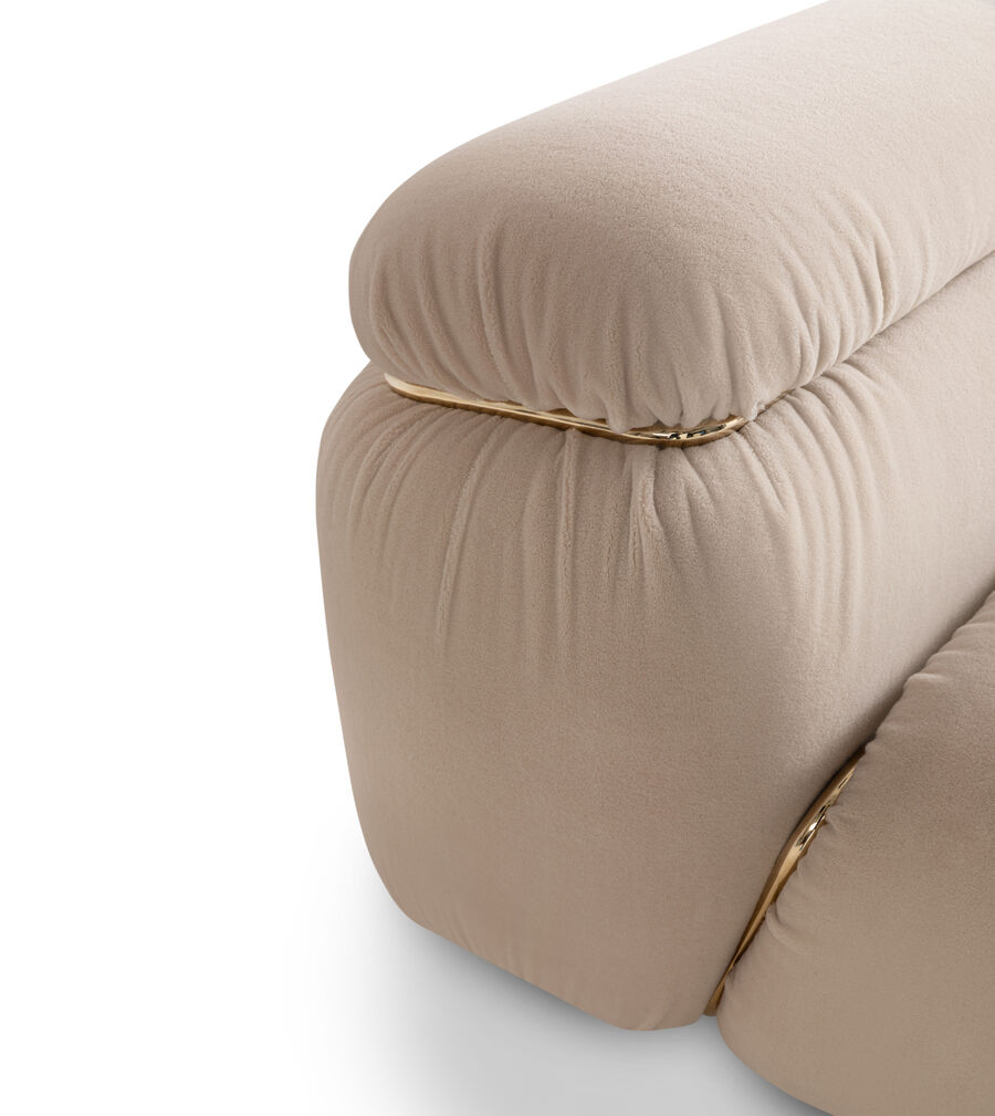 Dimorestudio revisits the Roma daybed. The asymmetric design of the distinctive rounded edges, together with a padded seat and cushions makes for a delightfully soft and inviting chaise longue. Curved geometric forms and brass details take inspiration from the Seventies, recreating the understated luxury associated with that decade’s design. Available in a choice of leather or fabric upholstery for a versatile style and exceptional comfort.