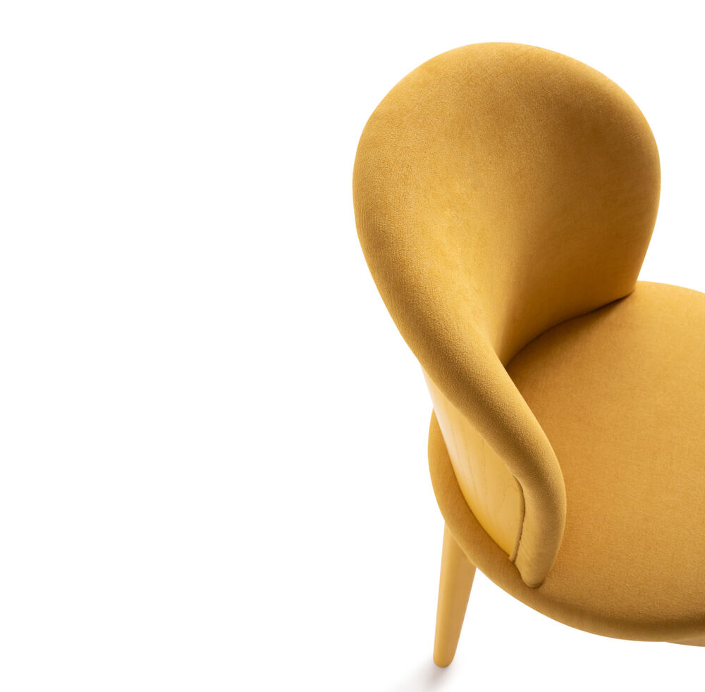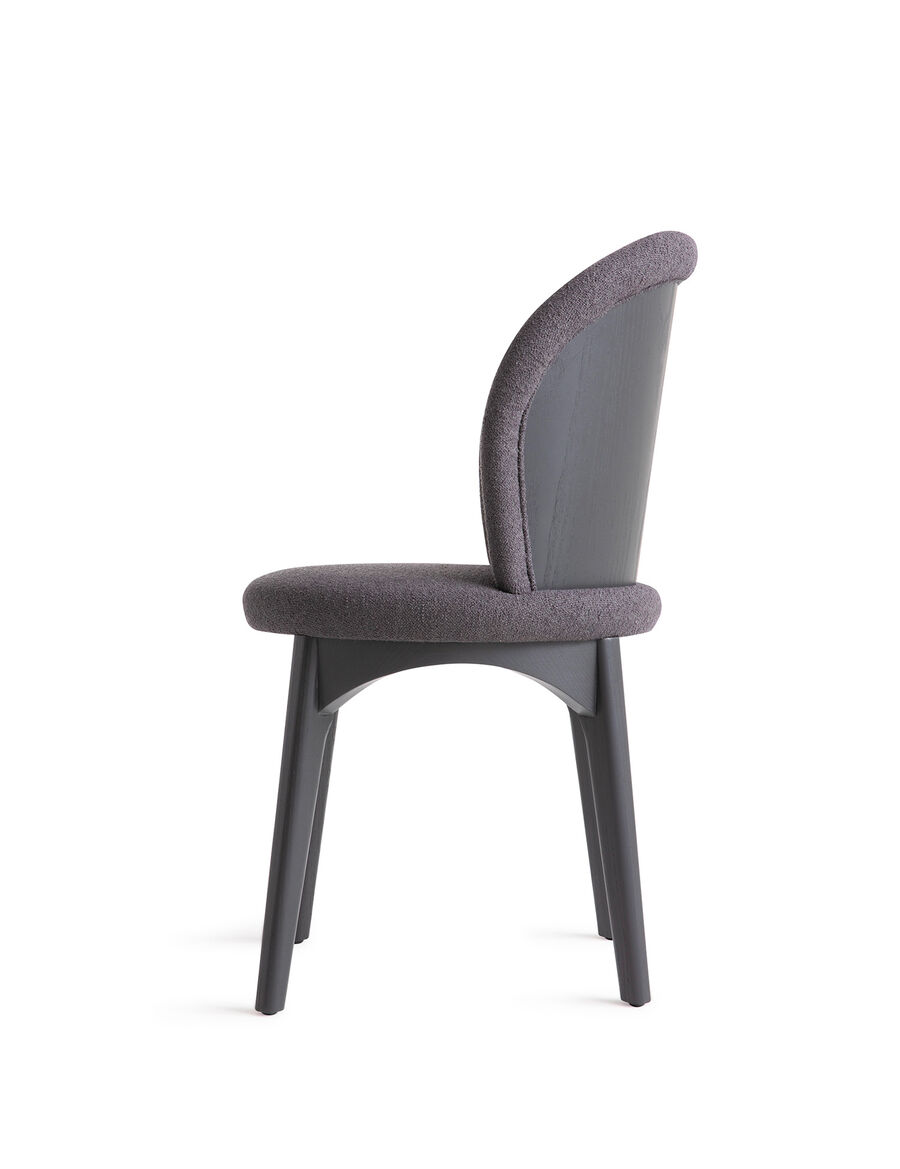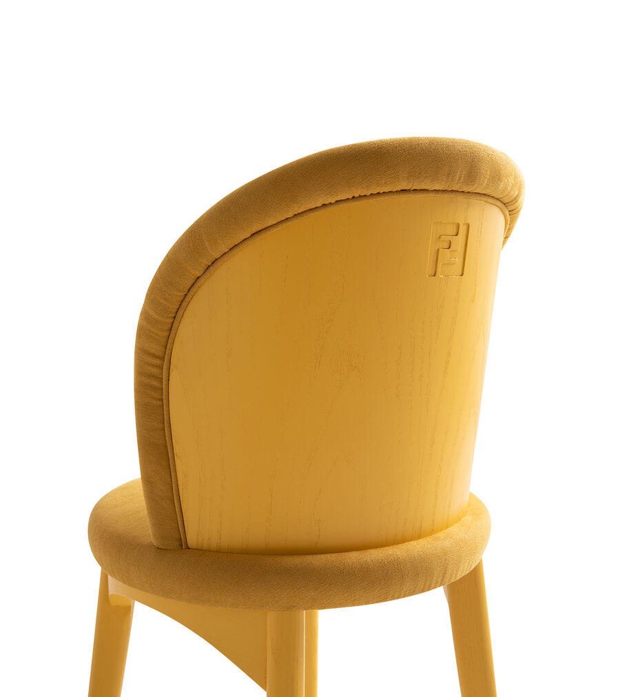 Designed by Cristina Celestino Studio, the Ottavia chair echoes Rome's signature architectural elements both in form and function. Showcasing simple geometries and soft lines, the piece is characterised by the arch-shaped legs in lacquered wood, inspired by Palazzo della Civiltà Italiana, and a curved wooden back engraved with the FF logo that seems to naturally unfold around the body. Upholstered for maximum comfort, this sophisticated design is ideal for both living and dining areas.