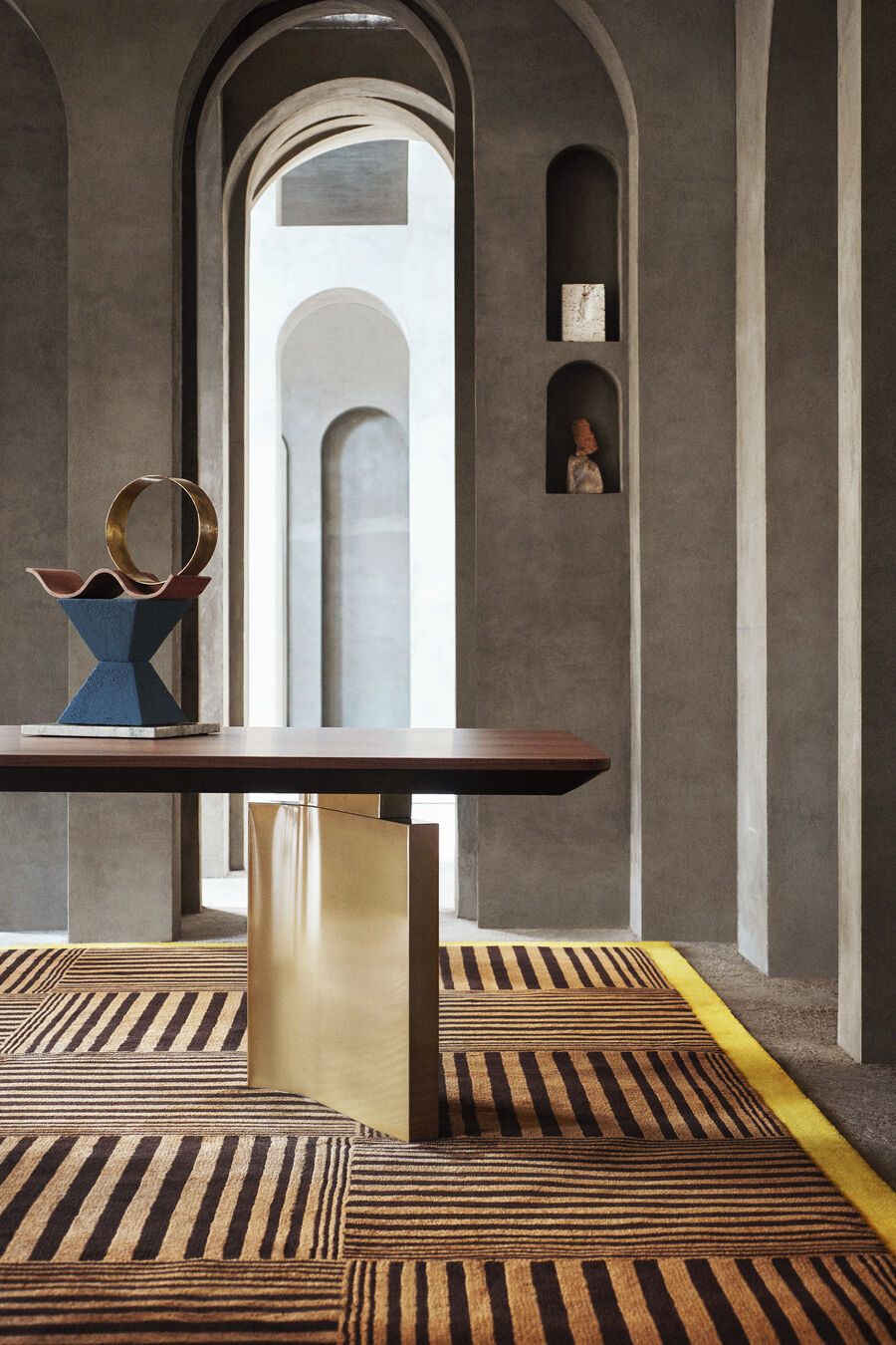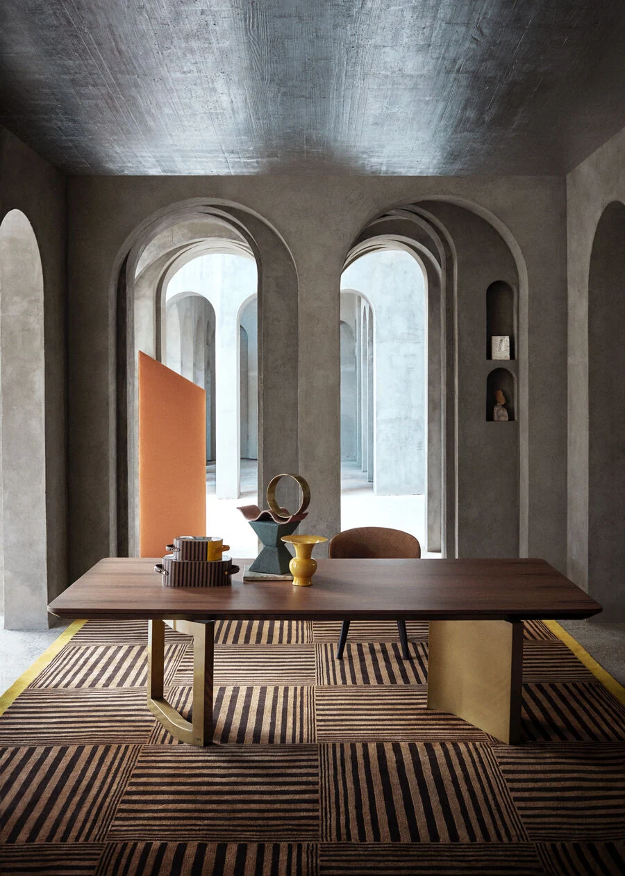 The Ford table brings together classic elements and unconventional, modern architecture. The top, available in both round and rectangular versions, sits upon asymmetric steel legs that have been folded and cut by hand to create a bold, eye-catching effect. Available in the various woods and marbles of the collection and featuring a matt finish, it goes beyond mere functionality to become a distinctive statement piece. With its large dimensions, it is ideal for large dining rooms, living zones and meeting rooms.