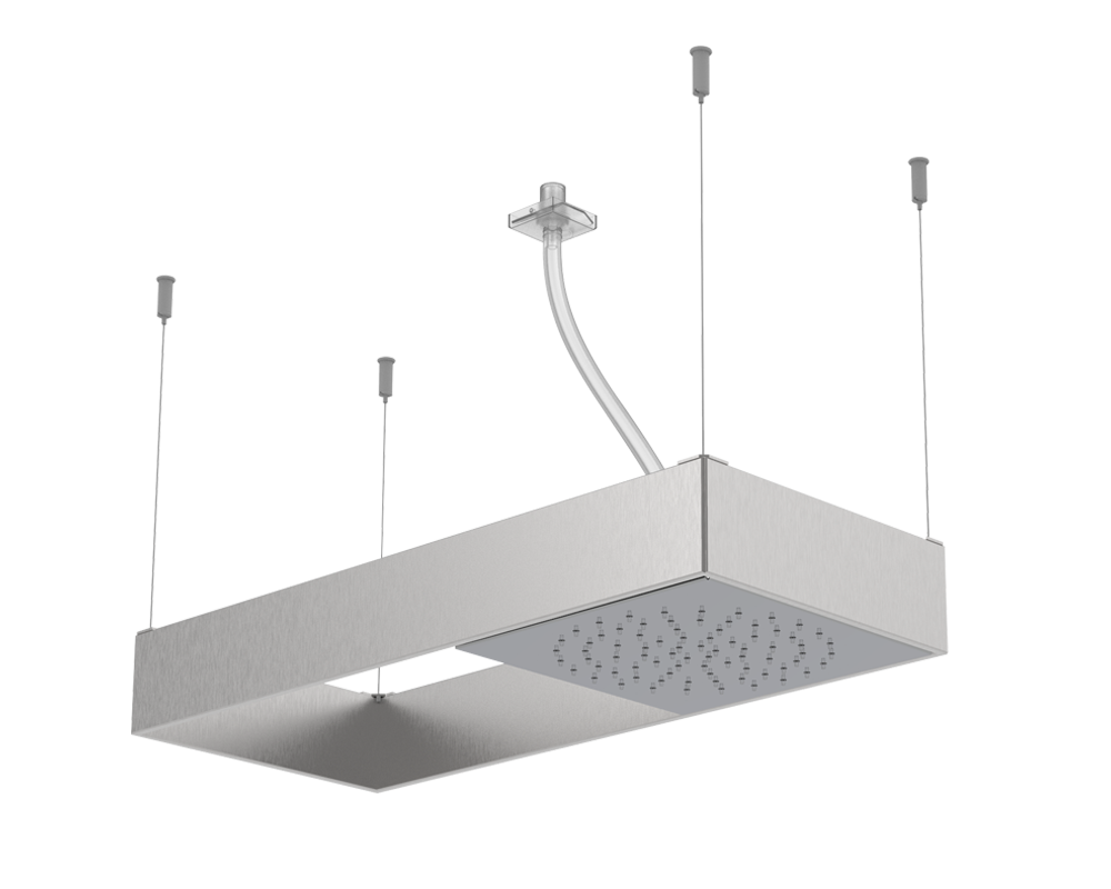 A livello formale Moove si caratterizza per un telaio rettangolare dalle linee minimal che ospita uno o più moduli in acciaio con due diverse funzioni - soffione rain tradizionale o lama d'acqua a cascata - che scorrendo al suo interno permettono di variare la posizione dell'uscita dell'acqua amplificandone la dimensione wellness.