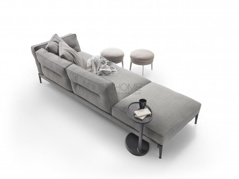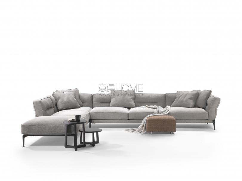 柔軟的扶手墊與靠墊通過簡單有效的滑扣系統安裝在底座上。 靠墊中央有一道獨特的橫向縫線鎖緊, 在真皮或織物面料產生了輕微的紋路, 不僅遵循人體倚靠靠背時的自然曲線, 更為沙發賦予了與眾不同的特點。