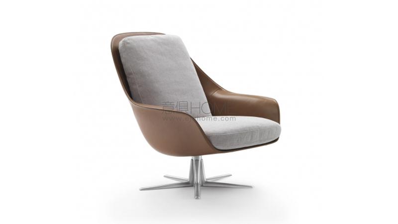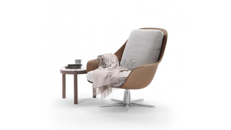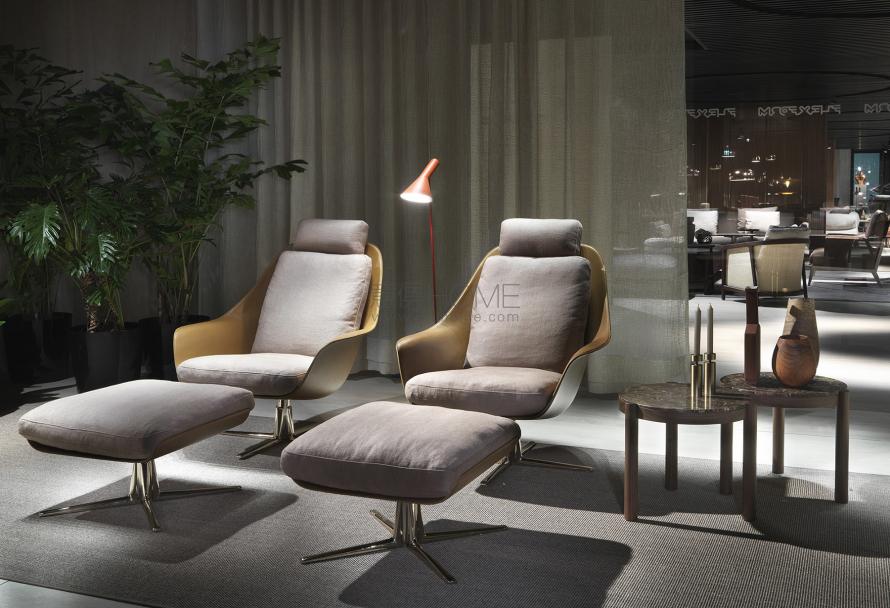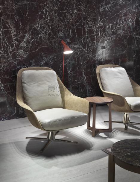 Sveva扶手椅獨特的特征在它優雅的側影中完全得到展示,讓人直接感受到它的飽滿性和舒適性。彎曲的外表由硬結構聚氨酯制成,真皮表面,坐墊松軟,鵝毛填充靠背。在四爪或五爪版本里可以看到可轉動壓鑄鋁底座,后者專為商務領域設計,滿足商務人士需求。 支撐底座可做的精加工工藝包括:拉絲金屬、鍍鉻、拋光,鍍黑鉻和香檳色。 外表可以使用9種不同顏色的真皮,坐墊外包可以使用Flexform系列專屬布料和皮制成,兩者之間可創造出許多搭配方案。 Sveva單人沙發可配同名擱腳凳。支撐底座的設計為一系列不同尺寸的小桌子的設計帶來了靈感,融合了考究的材質,精致的漆藝和珍貴的大理石。 Sveva單人沙發雅致的線條讓它可以輕松和各系列的長沙發搭配在一起,無論是在居家環境下還是在招待客人使用時,都顯得非常和諧。