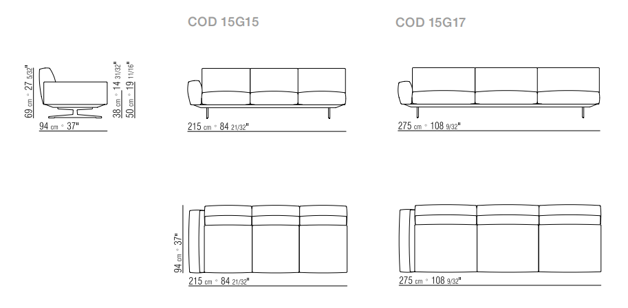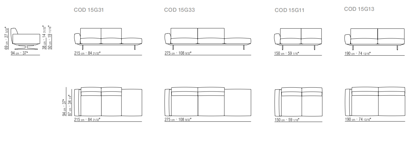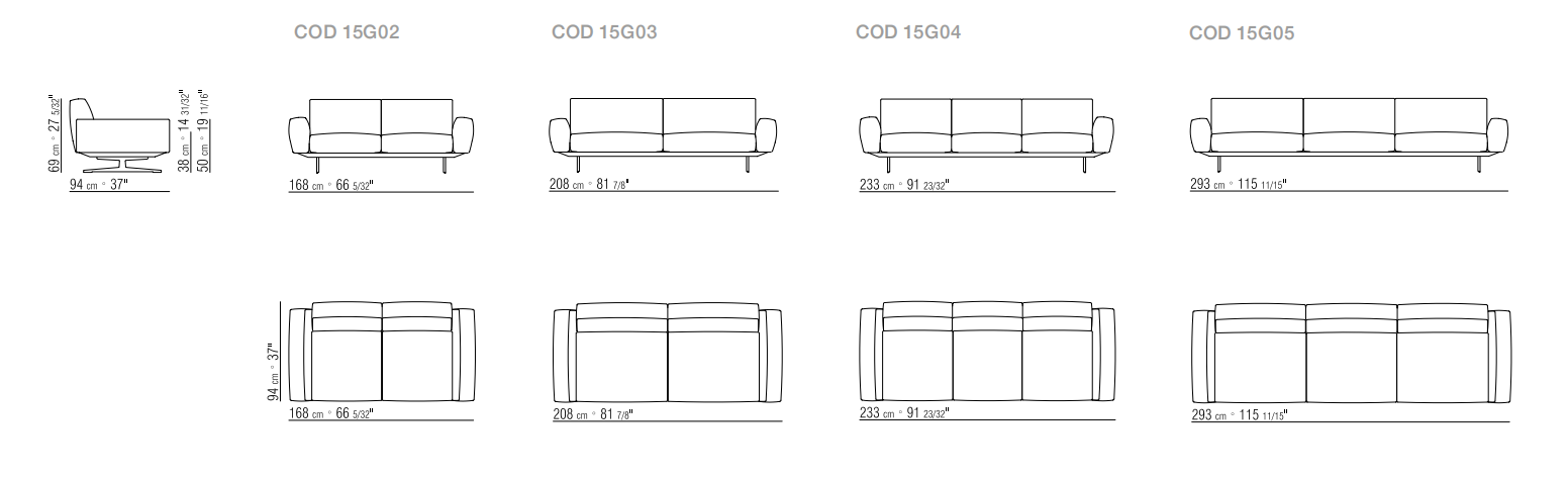 金屬底座表面覆蓋皮革,承托著填充了豐厚鵝絨的柔軟坐墊與靠墊。扶手有高版、低版可選,兩種不同的深度——Soft Dream版為94厘米,Soft Dream Large版為110厘米——