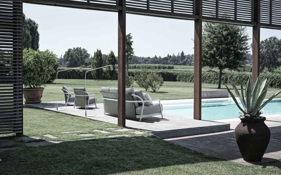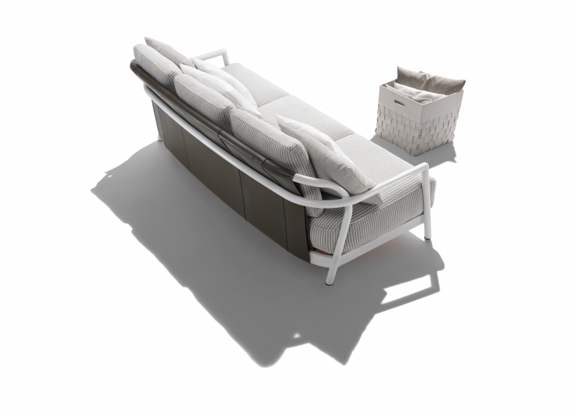 Alison扶手椅的戶外版本在保持著原設計的高品質基礎上,沿伸出兩人座,三人座。采用可保證出色戶外表現的材料。 框架的結構采用擠壓鋁材,表面涂層為環氧粉末噴漆,可選白色,卡其綠,酒紅色,磨光及磨砂鋁材,而底座則是采用航海復合板制成。 聚氨酯橡膠靠背色彩系列包括天然色調、波爾多色和橄欖綠色,而坐墊和靠墊則可以選擇戶外面料系列的所有織物。