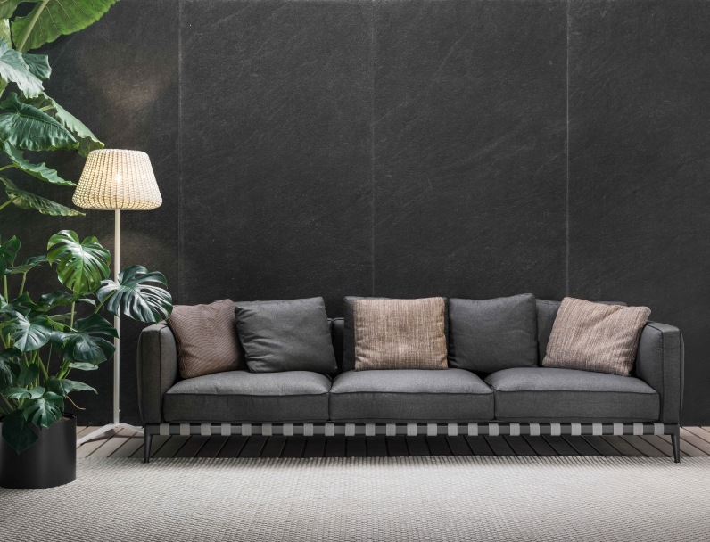 不銹鋼底座采用防水彈性織帶進行裝飾,而沙發(fā)的鑄鋁支腳則展現(xiàn)出精致,和諧的氛圍。