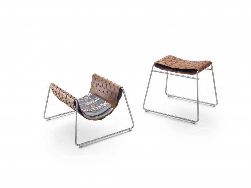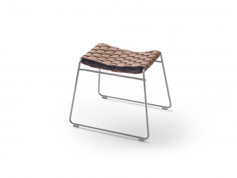 In contrast to the rigid metal structure, the upper part is made entirely of pliable hand-woven cowhide.