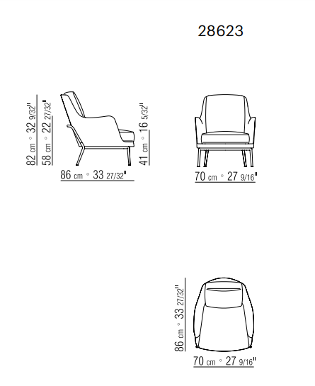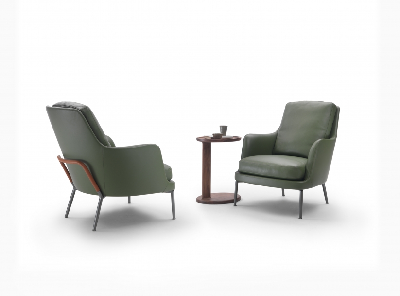 The enveloping shell of the armchair is in metal and polyurethane foam while the seat and backrest cushions are filled with goose down to ensure superior comfort.