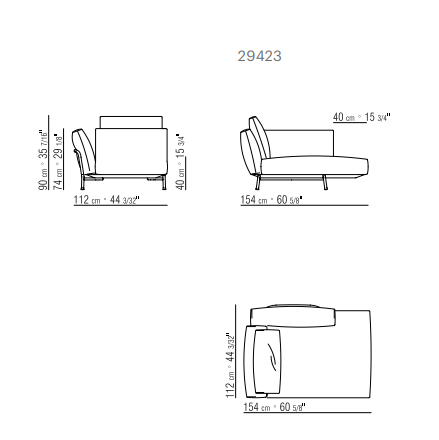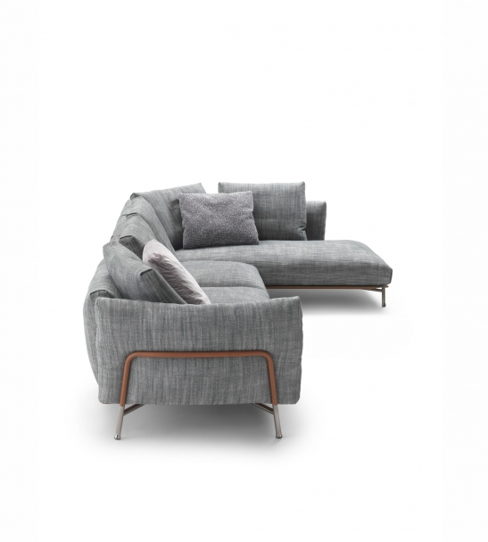 It expresses the extraordinary visual contrast between the lightness of the metal structure, available in a variety of finishes, and the ample seat and backrest cushions, generously padded in goose down, set against the cowhide-clad base.