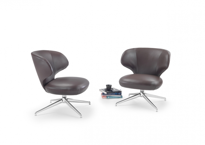 Slender and sleek, the Susanne small armchair sits on a metal stationary or swivel base.
