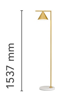 Floor lamp providing adjustable direct light. Painted steel or brushed brass, stem and metal spinning cone. Opal photoengraved PC diffuser by injection molding. White Carrara or Black Marquina marble base. Power cord length 260 cm, with foot dimmer switch that provide ON-OFF functions and 10-100% light adjustment. Plug-in power supply with interchangeable plugs