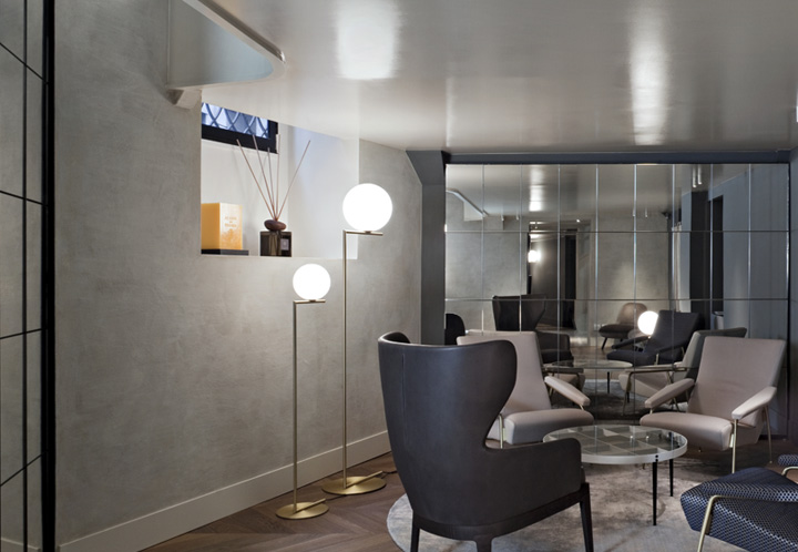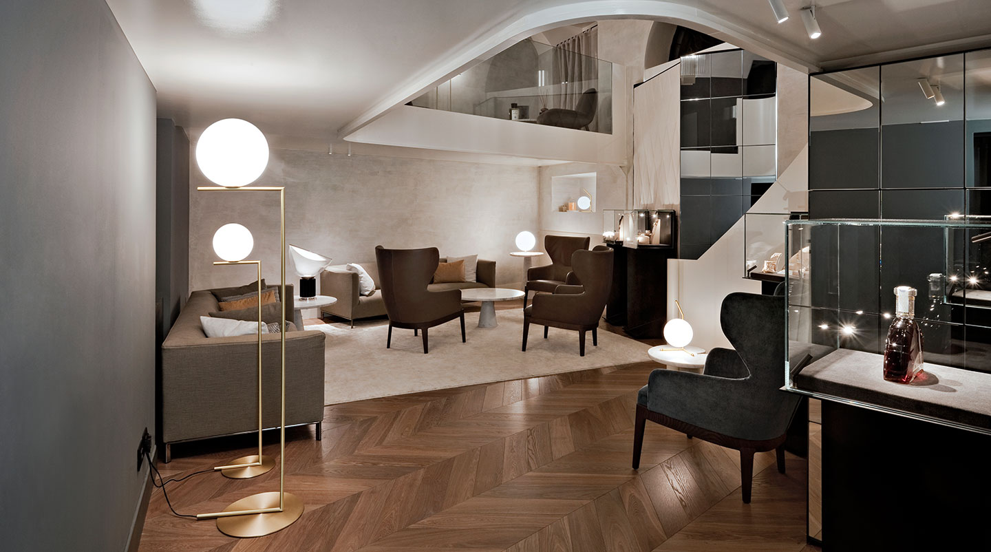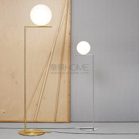 Floor lamp providing diffused light. Frame in brass, brushed and transparent varnished or chrome steel. Blown glass opal diffuser. Dimmer on the power chord.